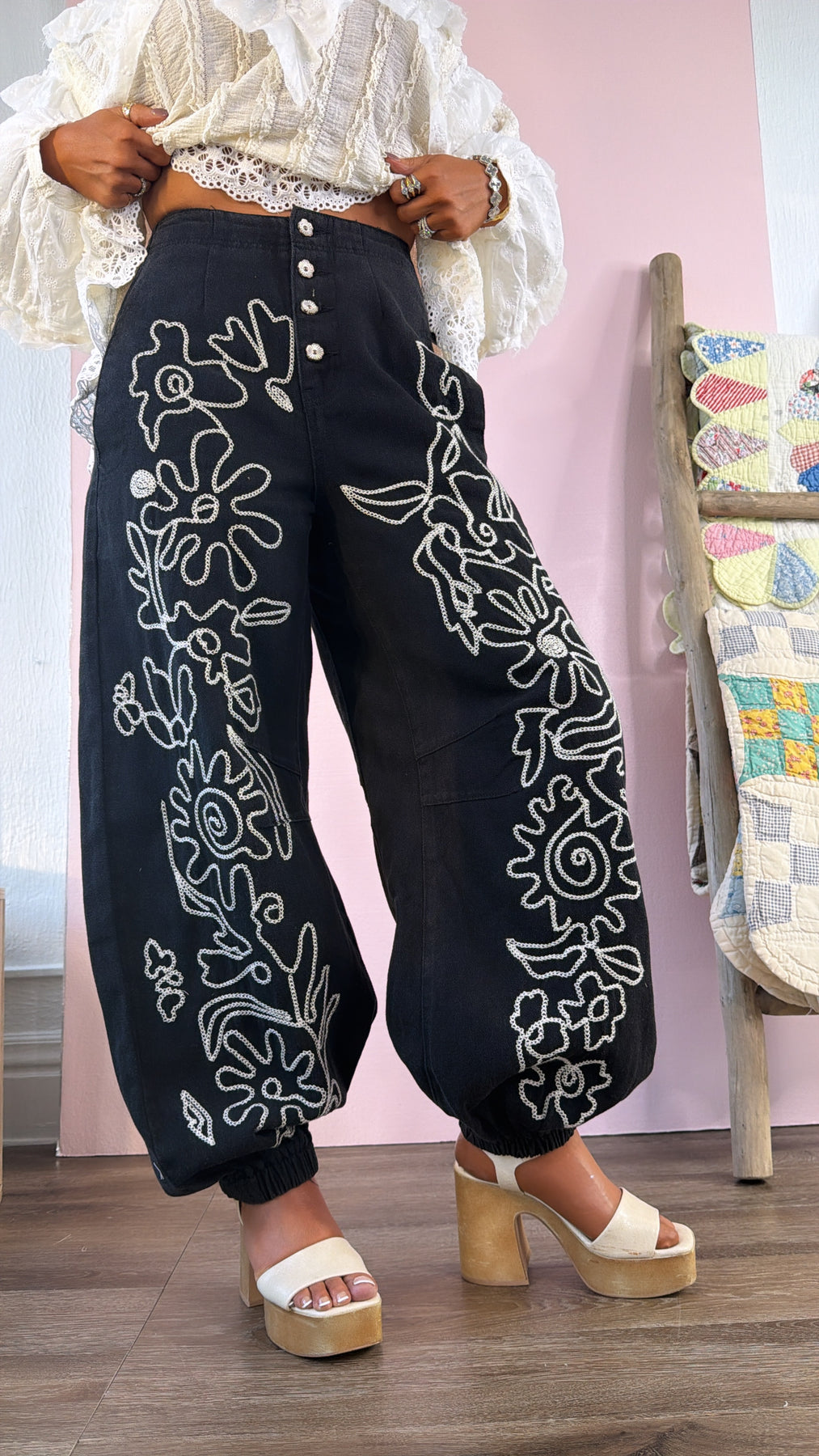 Hit the streets of style wearing these POL: For The Love Of Floral Embroidered Jogger! With embroidered detailing and a relaxed jogger-style fit, you'll be sure to turn heads no matter the occasion. Make 'em your go-to for a unique look!