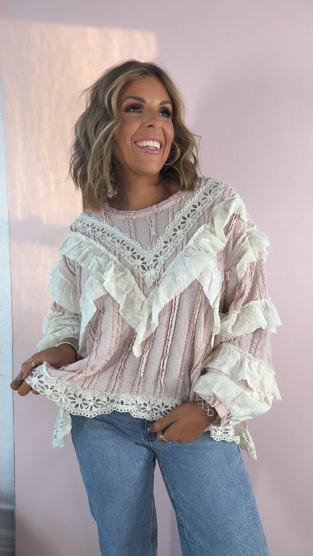 The soft pink hue paired with creamy lace accents gives this blouse that perfect “romantic boho” vibe easy to dress up or down for everyday wear