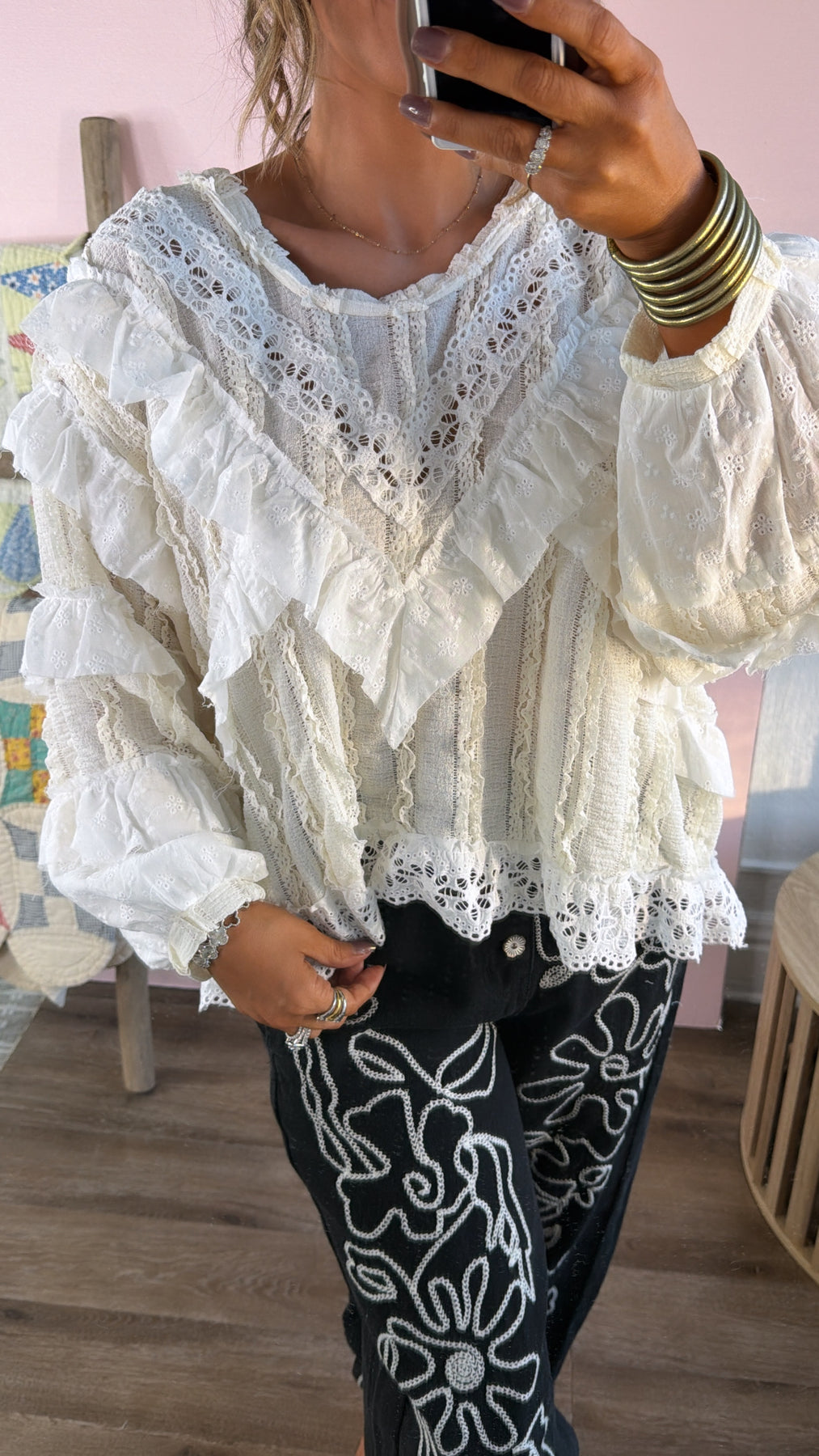 Romantic, airy, and effortlessly feminine. The Sweet Fern Blouse is all about soft textures and vintage-inspired charm. Designed with delicate lace striping, layered ruffle details, and a flowy silhouette, this blouse feels dreamy while still being easy to wear. The natural ivory tone keeps it timeless and endlessly versatile.