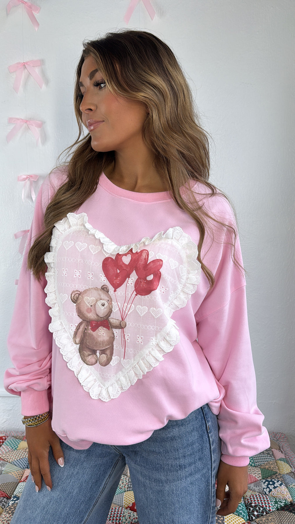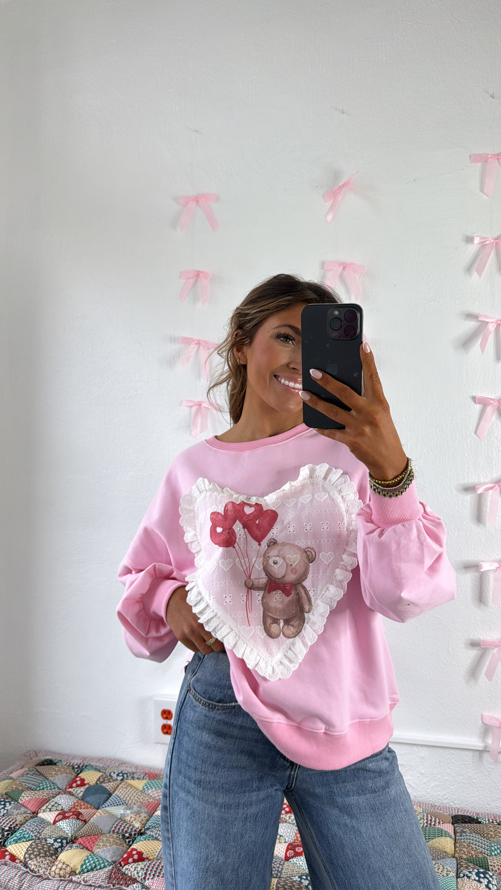 Sweet, cozy, and full of Valentine charm, the Valentine’s Bear Patched Sweatshirt is the ultimate feel good piece. Designed in a soft pink hue, this sweatshirt features an adorable teddy bear graphic holding heart balloons, framed by a delicate lace trimmed heart patch for an extra feminine touch. The relaxed fit and cozy fabric make it perfect for lounging, casual days out, or spreading a little love all season long.