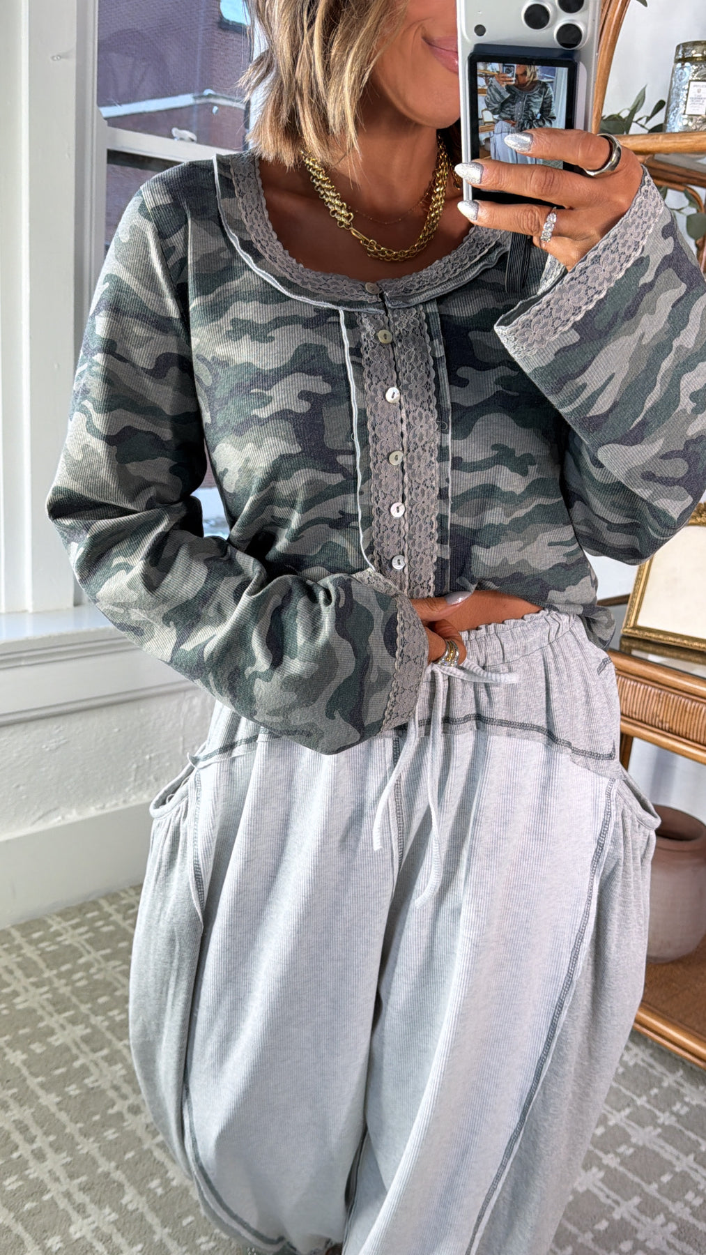 Effortlessly cool with a touch of feminine charm, the Ronan Top brings a fresh twist to classic camo. This soft, lightweight knit features a relaxed fit and a timeless camo print, while delicate lace trim and a functional button-front henley detail elevate the look with subtle sweetness. The scoop neckline and wide cuff sleeves add laidback ease, making it the perfect blend of rugged and romantic.
