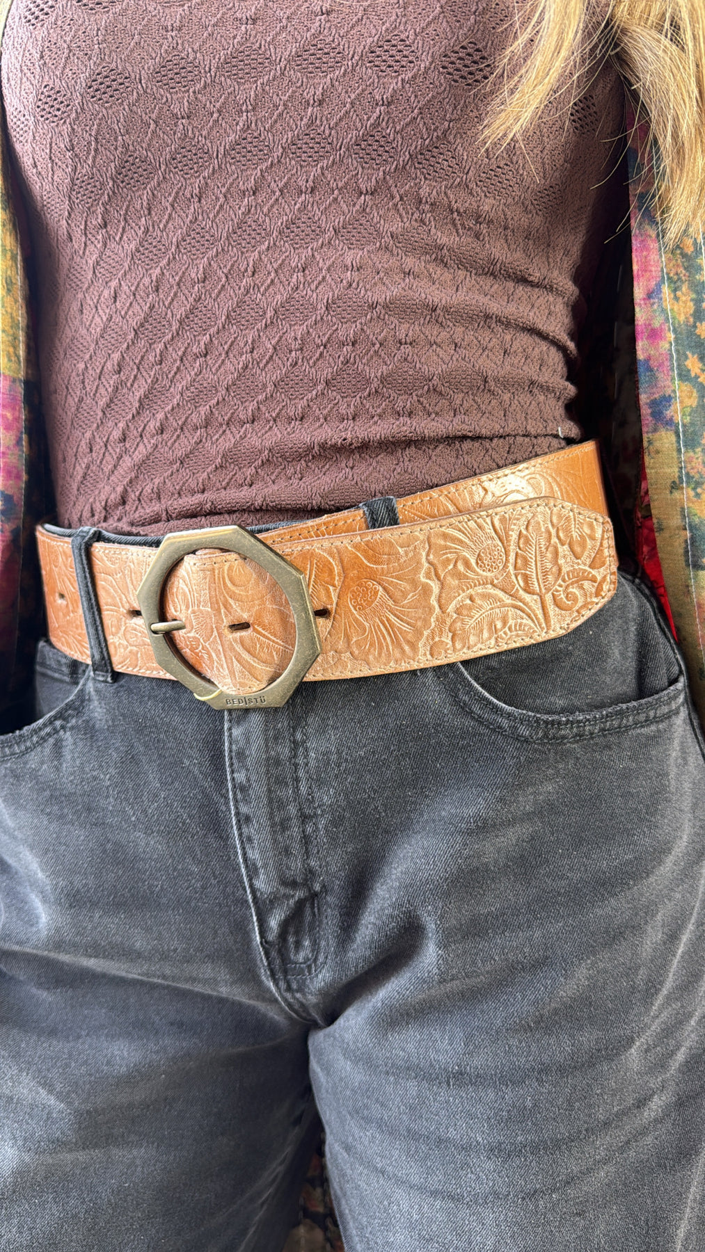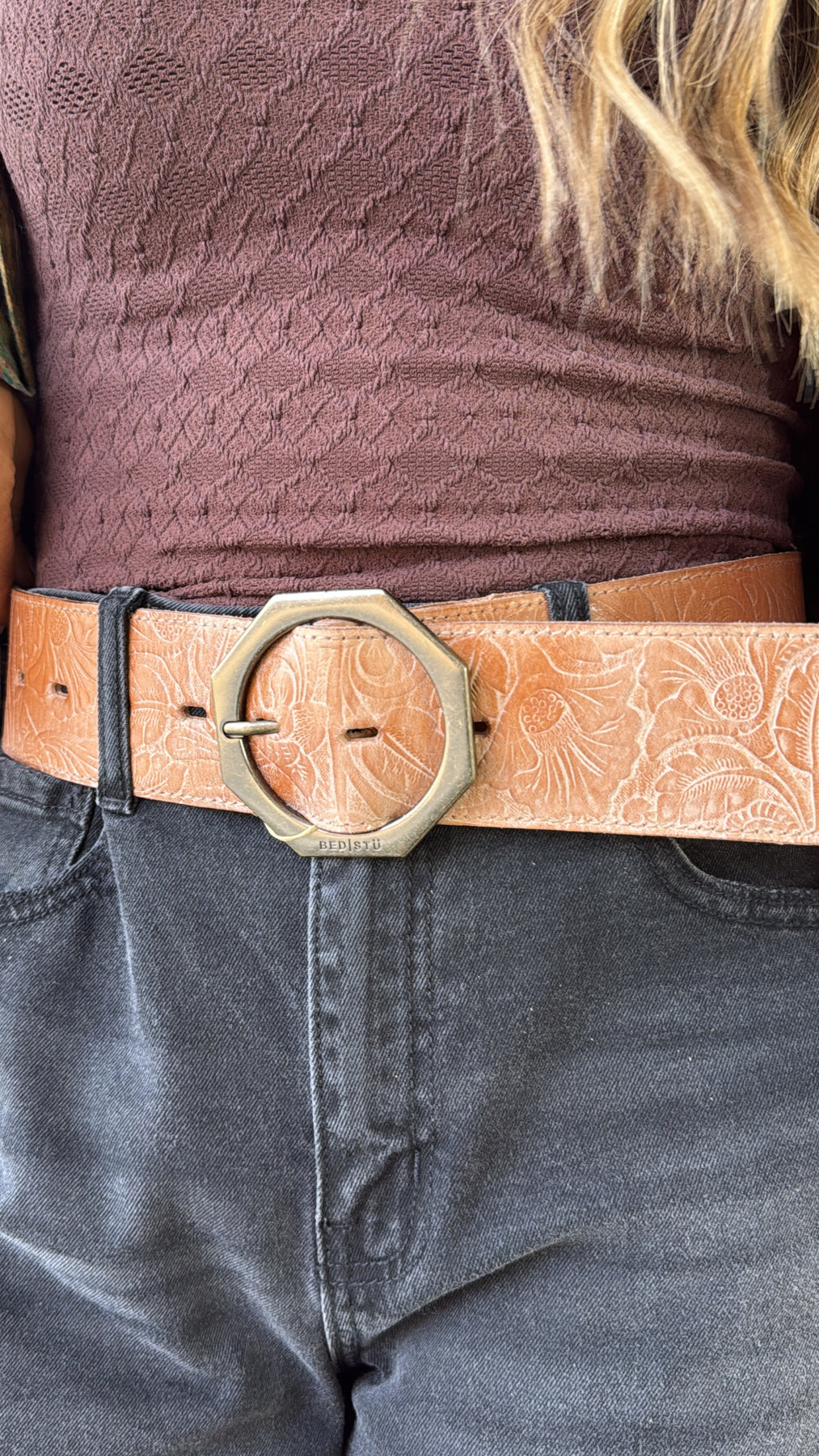 Dreampath EM is the perfect blend of rugged durability and modern style in an everyday belt. Crafted from genuine leather using a technique of heat embossing to create a design atop the leather and finished with clean-edge stitching. Its bold octagon-shaped metal buckle, stamped with the BED|STÜ insignia and reinforced with three oversized rivets, delivers an edgy yet refined look. Built to last and elevate every outfit.