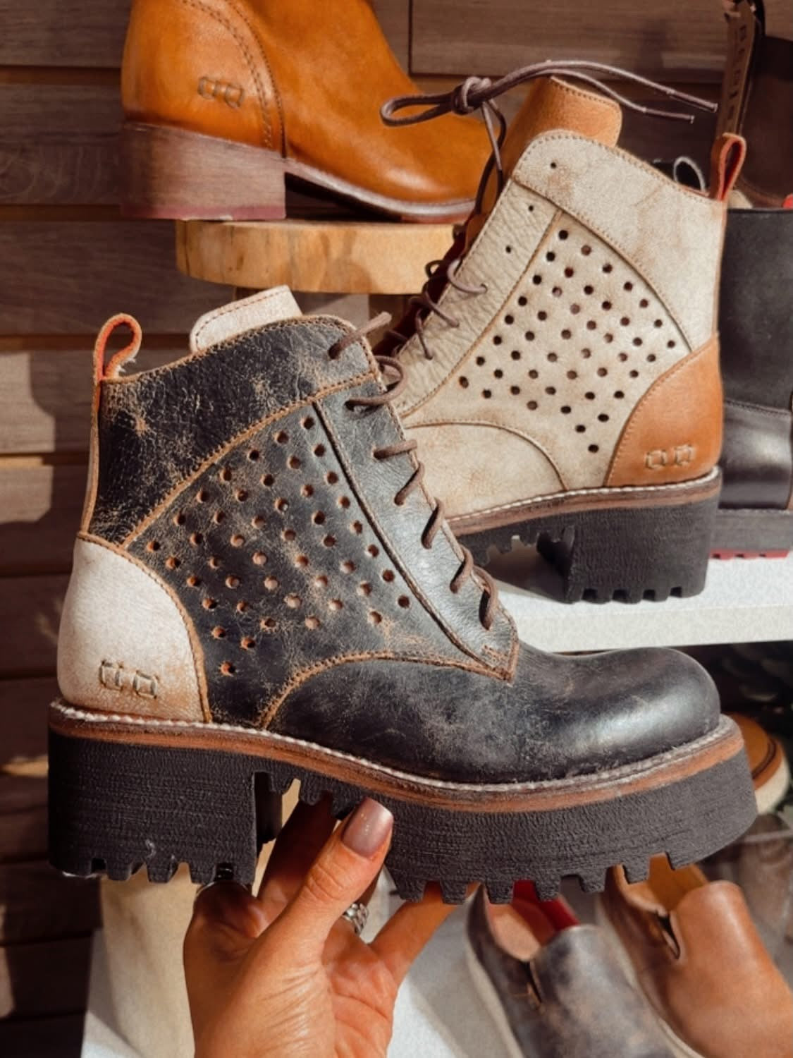 Through DMs online between our staff, we are ALL talking about this one. Make a bold fashion statement in TANZANIA. This eccentric ankle boot has a unique design and stands out with its playful elements, including circular perforations, red leather lining and two-tone leather effect. TANZANIA has a chunky platform sole providing a comfortable, lightweight, and stable base to walk on. TANZANIA has a rounded toe, and lace-up front has you fit and secure. Pair TANZANIA with your favorite maxi dress, or a vintage pair of cuffed denim and top off with your cherished stiff brim hat.