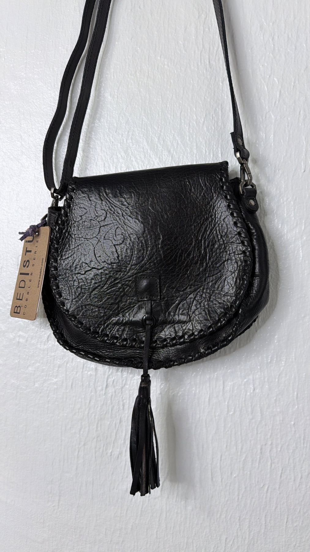 The Bedstu Half Moon EM Crossbody combines effortless sophistication with artisan detail. Crafted from genuine hand-finished leather, this compact saddle-style bag features a beautifully embossed texture and a statement tassel accent. Its adjustable strap and fold-over flap design make it perfect for hands-free wear with a touch of Western charm.