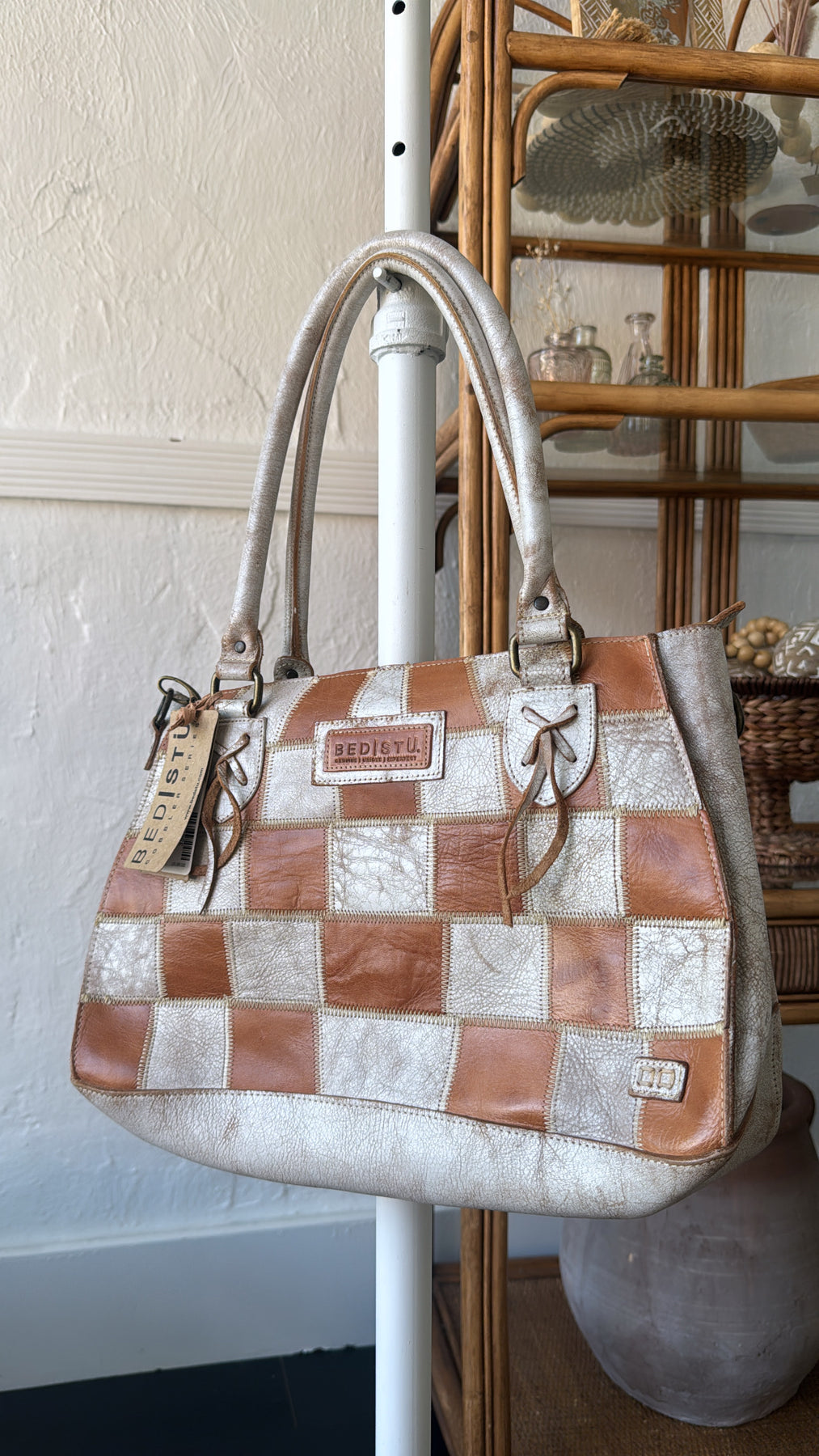 - Unique patchwork front panel made from scrap leather
