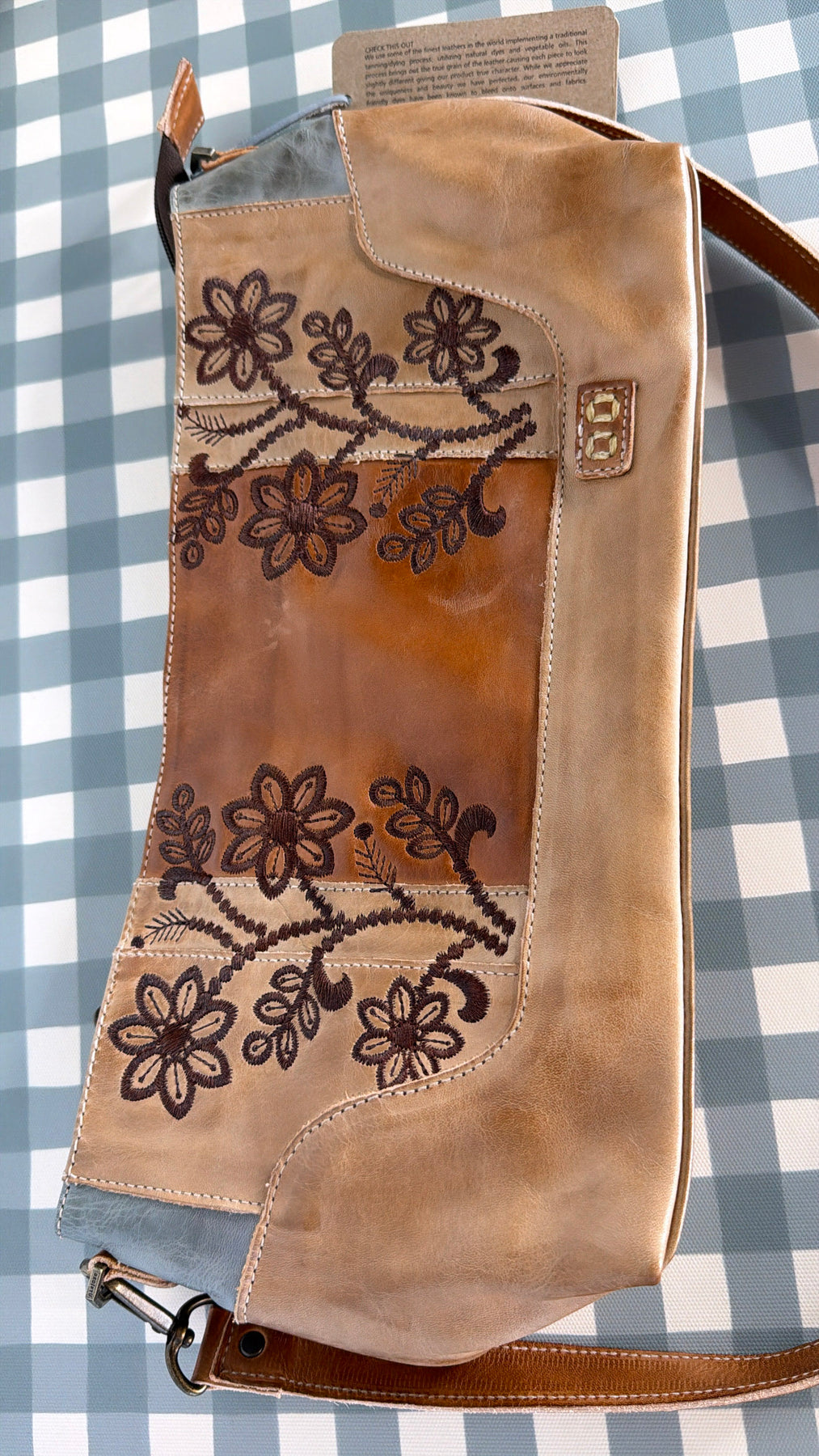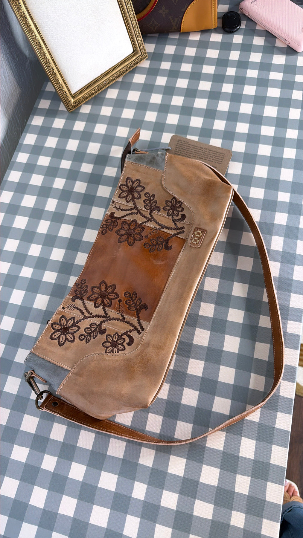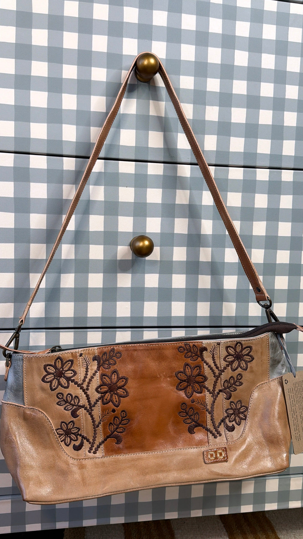 Crafted from rich, hand-finished leather, this shoulder bag features beautifully embroidered floral detailing across the front panel, adding texture and vintage-inspired charm. The warm desert stone tones paired with rustic brown accents make it an effortless neutral that complements everything from denim to flowy dresses.
