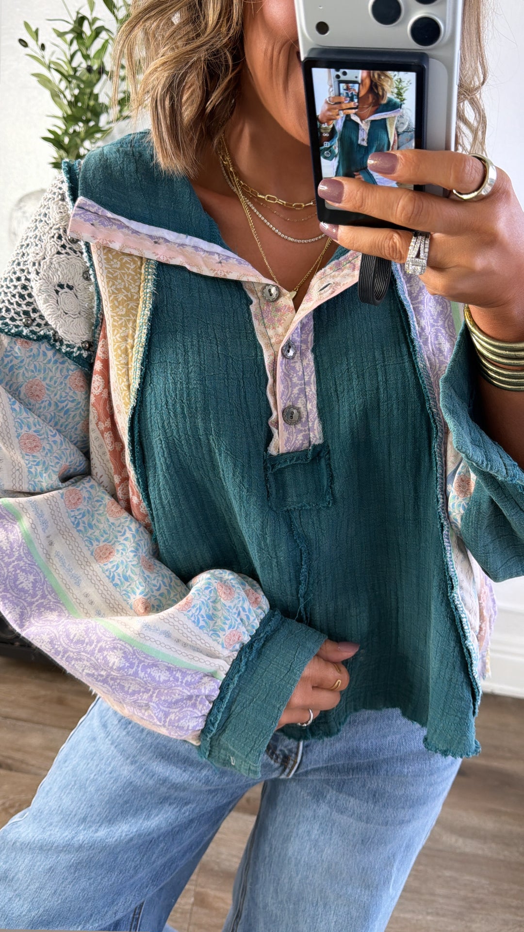 Tulip Skies Button Up Blouse, Teal Green