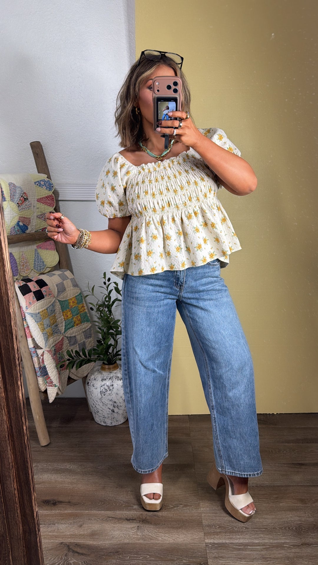 Rosie Ann Smocked Top, Cream/ Yellow Floral