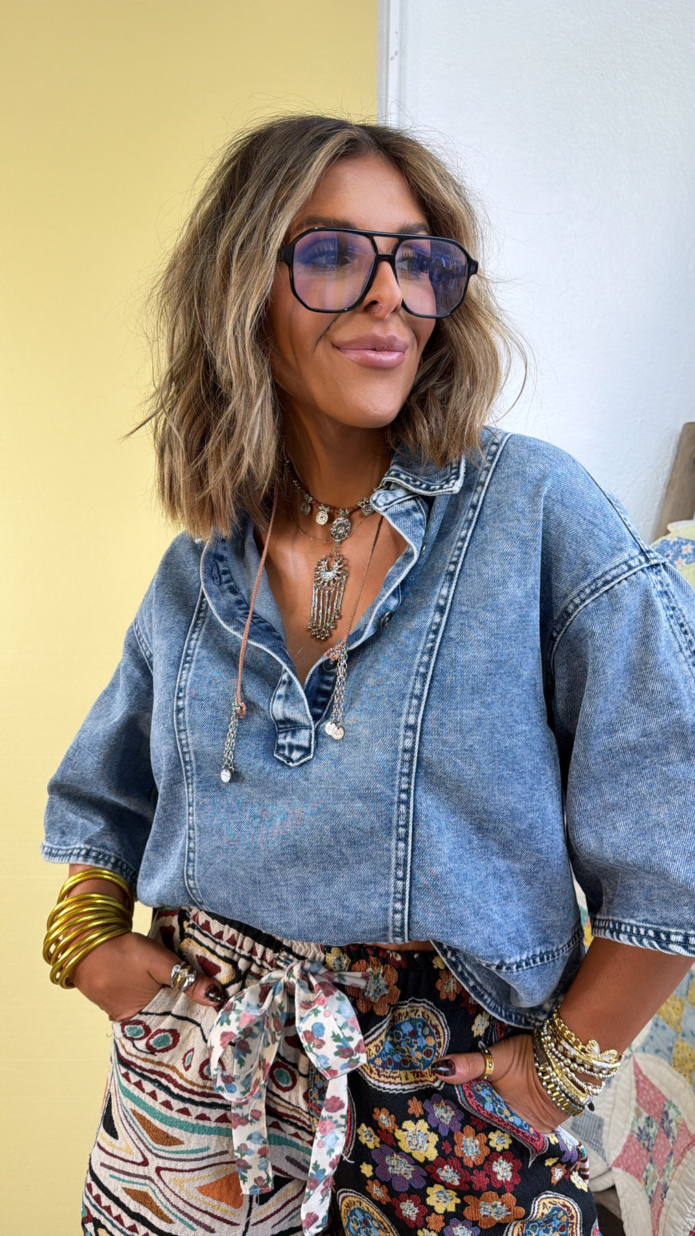 Casual, cool, and endlessly versatile the Bluebird Denim Top is your new everyday favorite. Designed with a soft washed denim feel, this top features a relaxed, boxy silhouette with an easy half button neckline for that perfectly undone look.