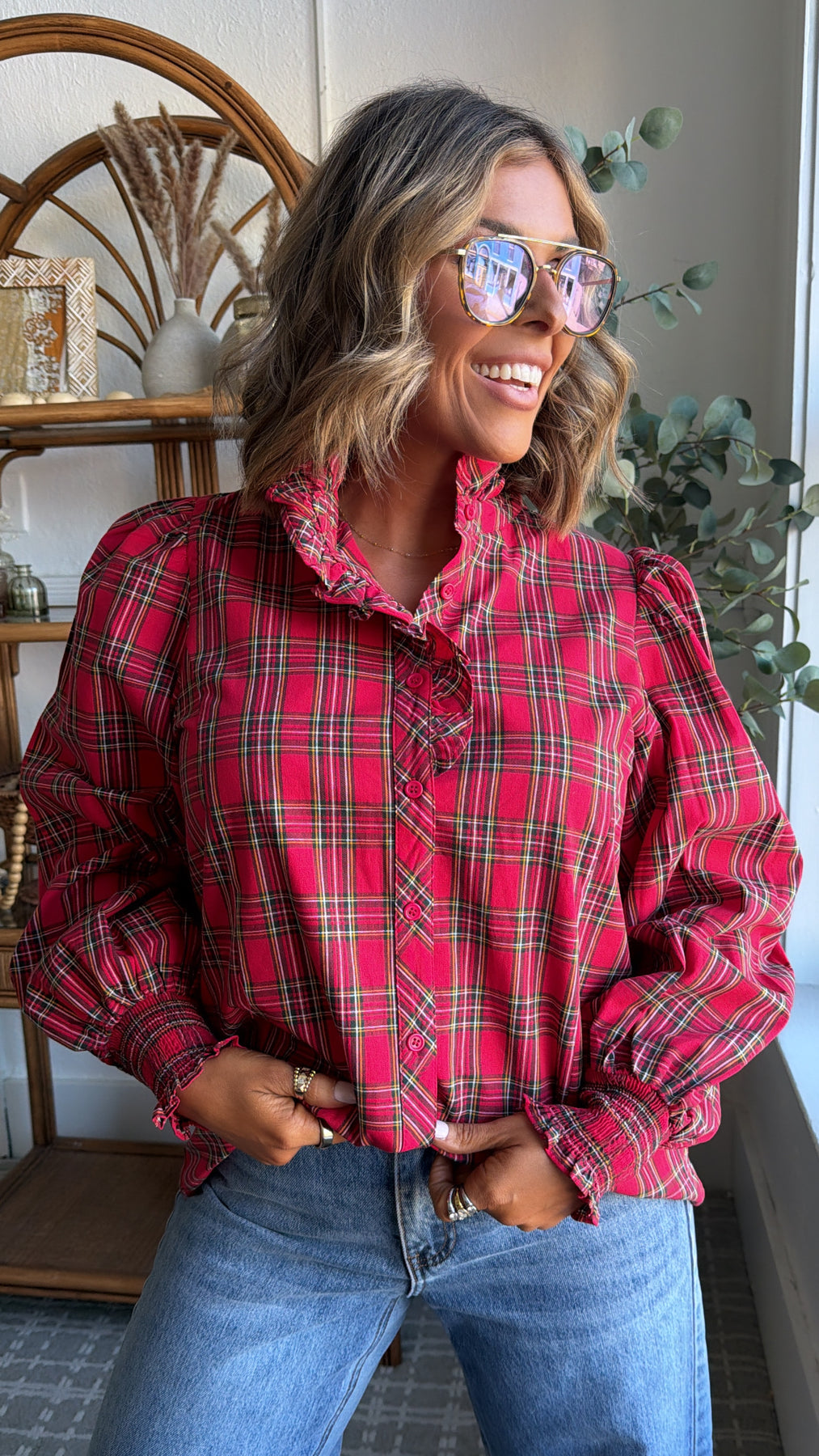 This blouse is a mixture of chic charm and vintage-inspired color tones. The muted colors make for a gorgeous plaid design, while its flowy, relaxed cut creates effortless movement, making it perfect for casual outings or even holiday parties