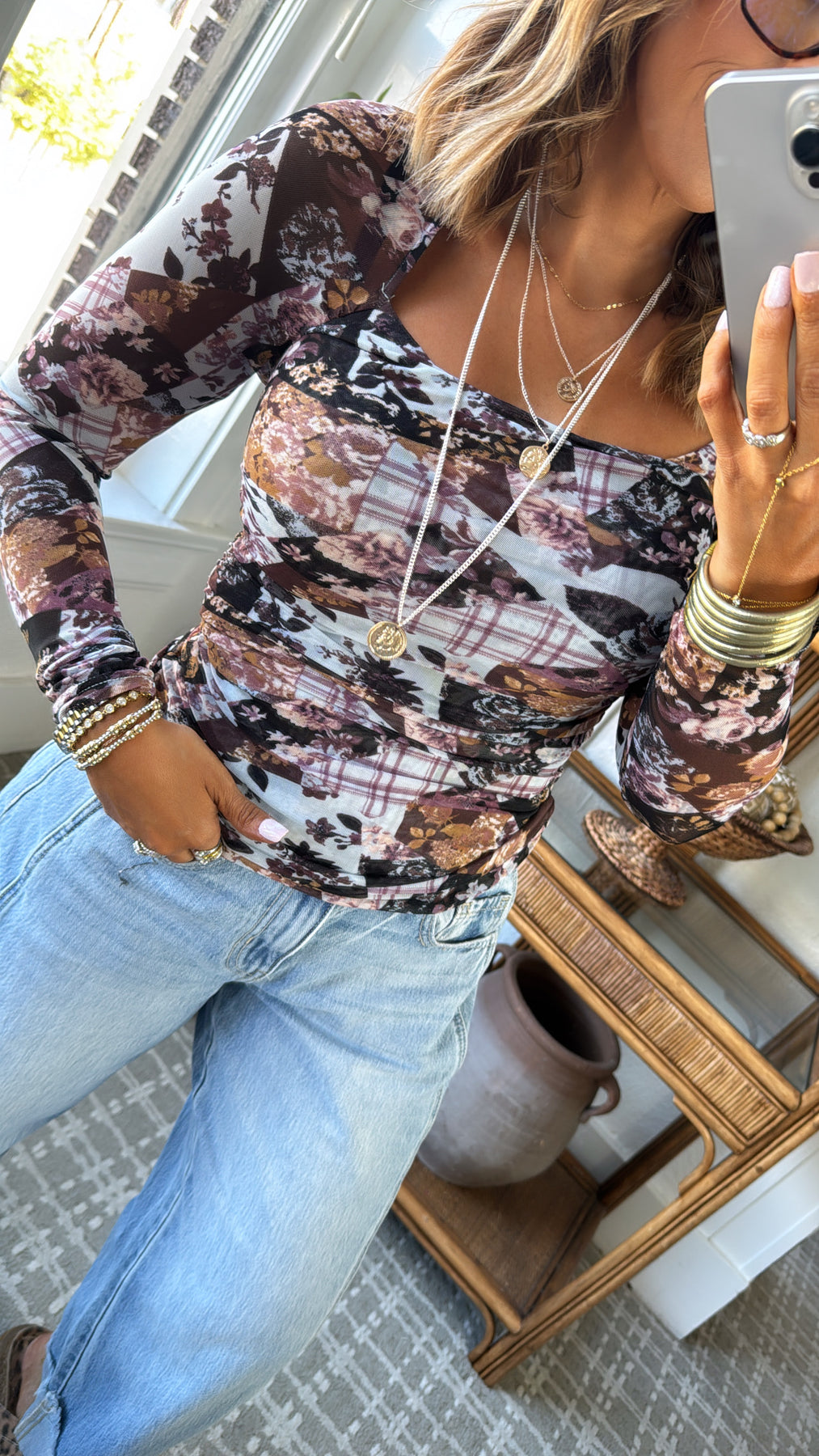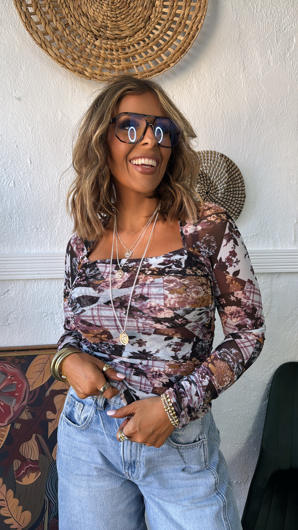 Elevated and effortlessly cool, the Faded Flora Mesh Top brings blue/purple tones and artistic texture to your wardrobe. Featuring a patchwork blend of muted florals and plaid, this double-layered mesh bodice offers comfort and coverage with just the right amount of stretch.