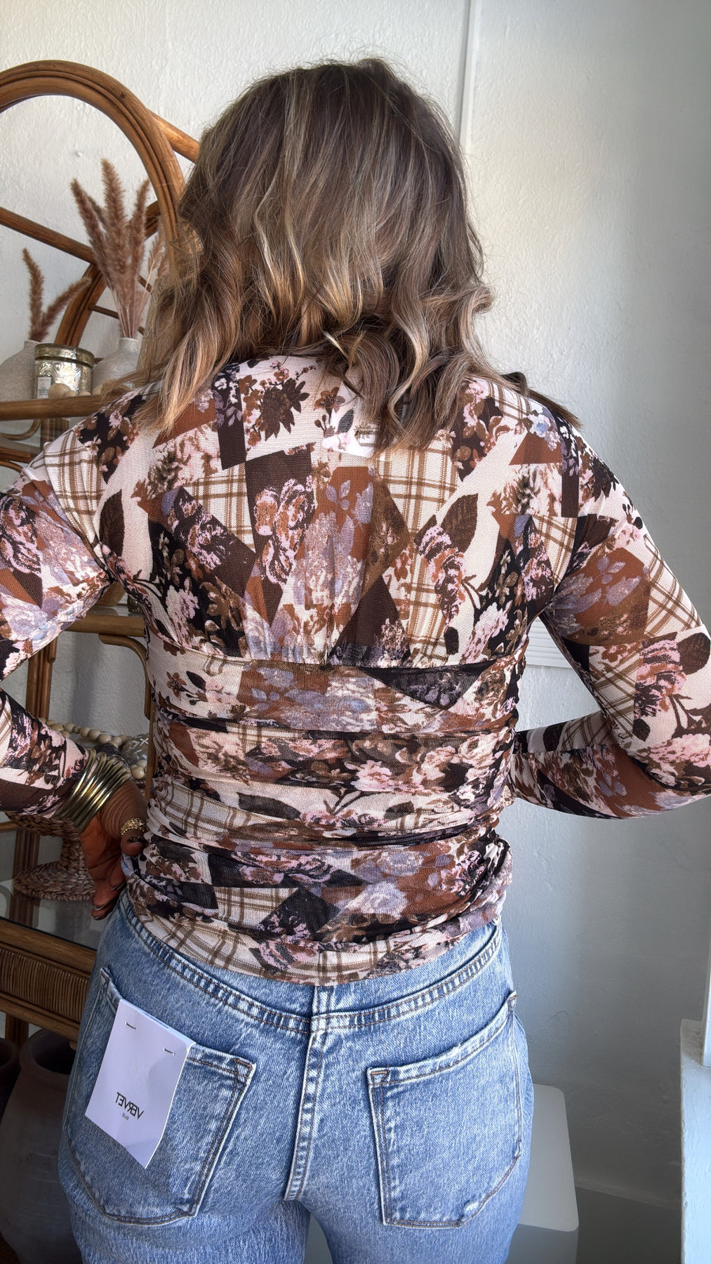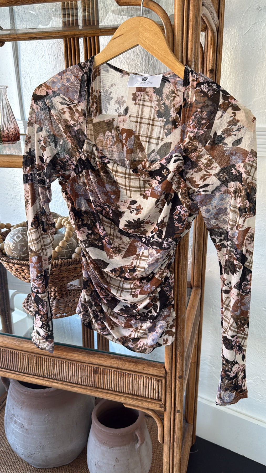 Elevated and effortlessly cool, the Faded Flora Mesh Top brings earthy tones and artistic texture to your wardrobe. Featuring a patchwork blend of muted florals and plaid, this double-layered mesh bodice offers comfort and coverage with just the right amount of stretch.