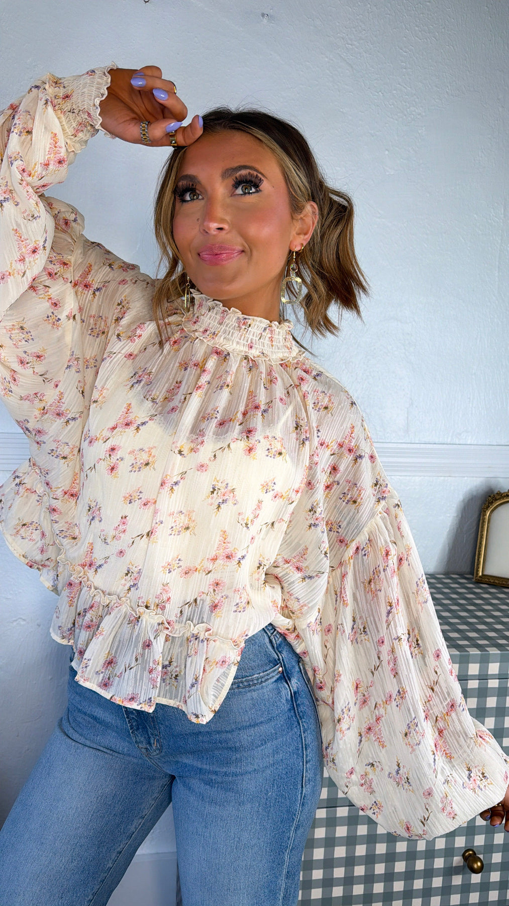 Designed with a delicate scattered floral print over a creamy base, this blouse features a flattering smocked high neckline and a softly gathered bodice for that effortlessly feminine silhouette. The flowy, pleated fabric and billowy sleeves create beautiful movement, while the ruffled hem adds the sweetest finishing touch.