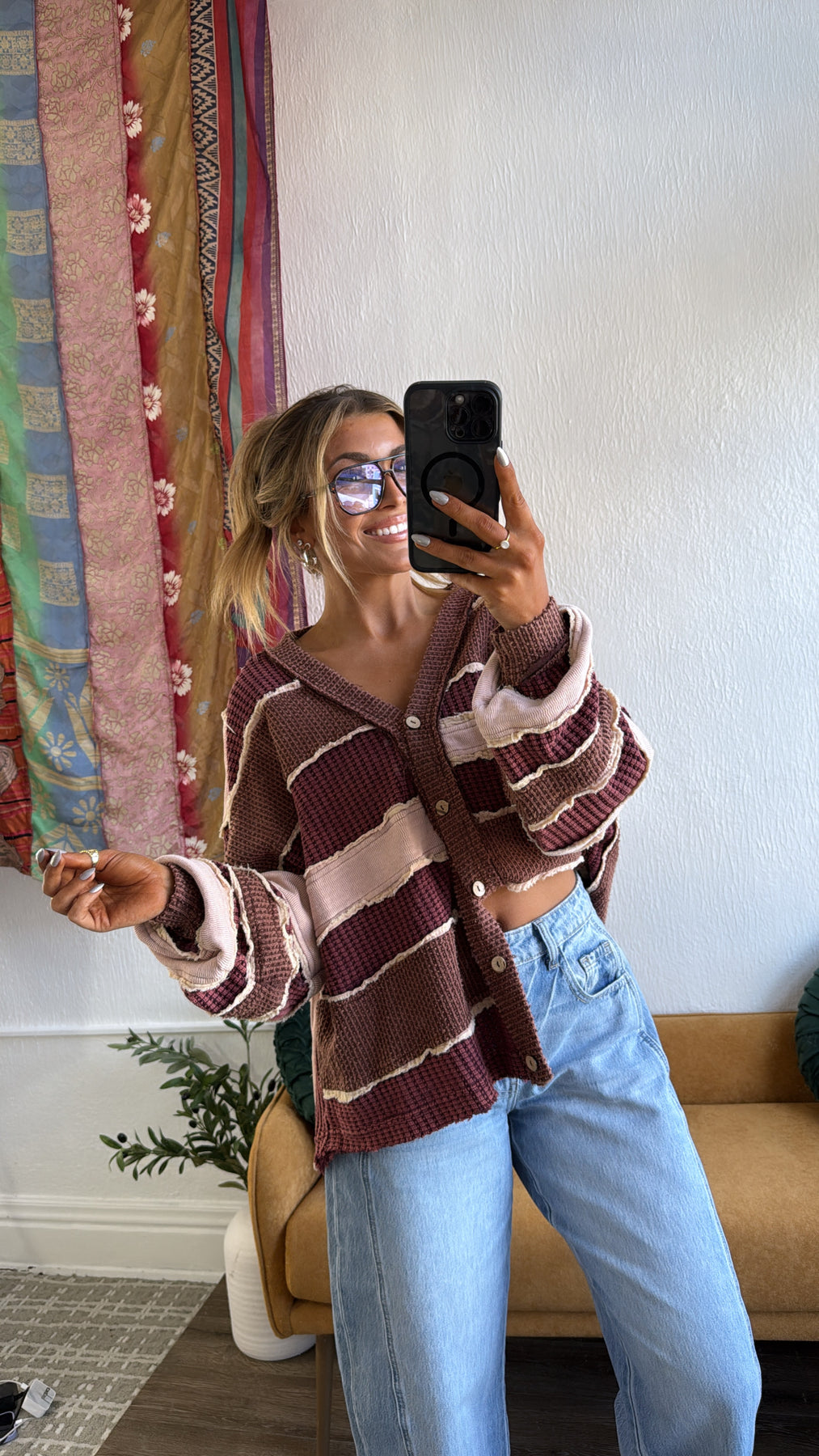 Add a gorgeous wine hue to your everyday outfit. The Lilou Cardigan is a true statement-maker. This piece features varied size striping throughout, a comfortable waffle knit fabrication, and full button front closure. .