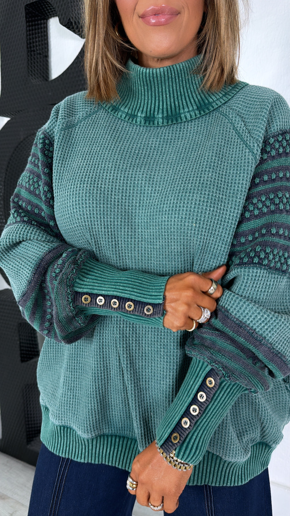 Contrasting patterned sleeves with button cuff accents