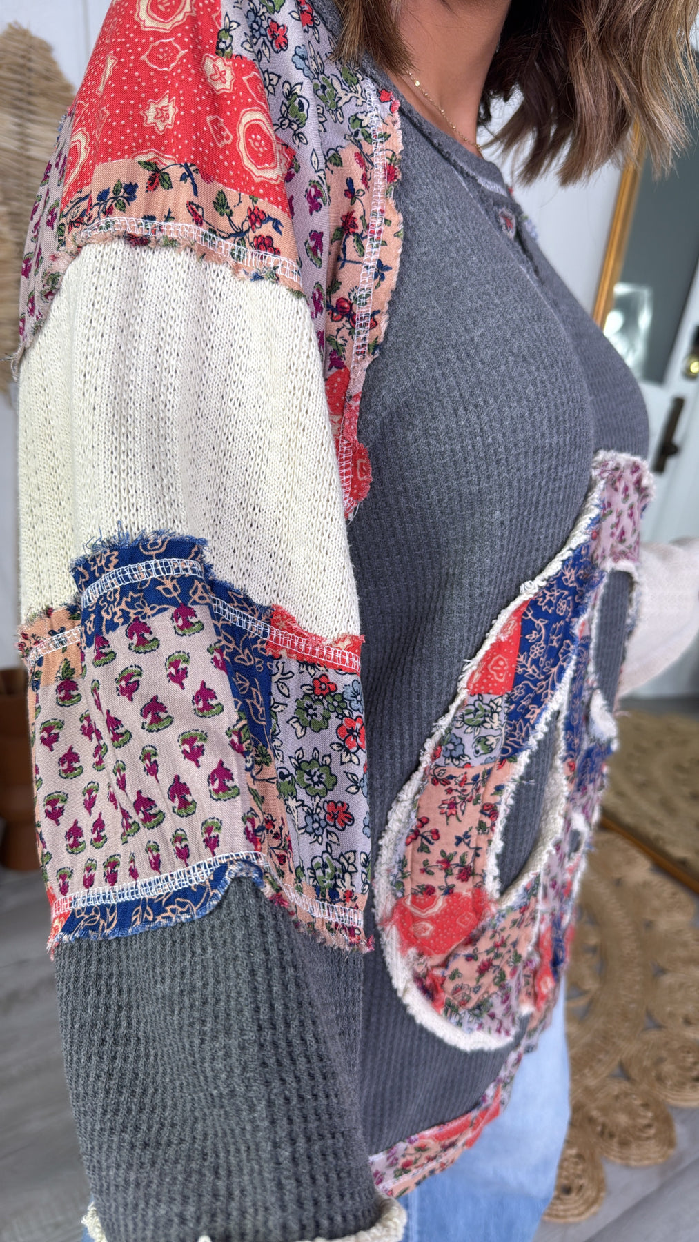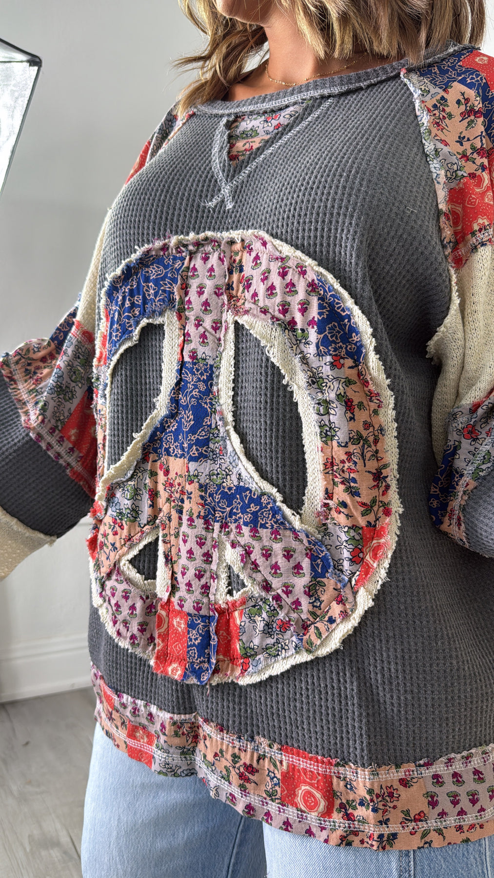 Keep it cool in our Patched Peace Top. This boho-inspired piece offers a trendy and relaxed fit. Perfect for pairing with denim. A fun patchwork piece everyone will love.