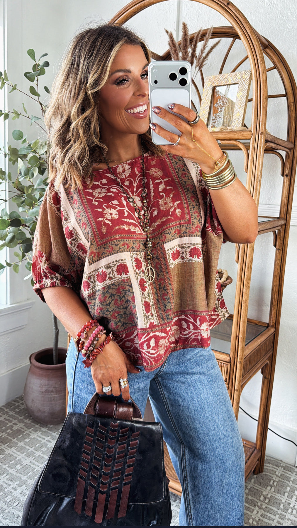 Meet your new boho favorite - the Redwood Muse Blouse. This effortlessly chic top features a rich patchwork-inspired floral print in earthy tones of redwood, cream, and olive. Its flowy silhouette, dolman sleeves, and soft, breathable fabric make it the perfect blend of comfort and artistry.