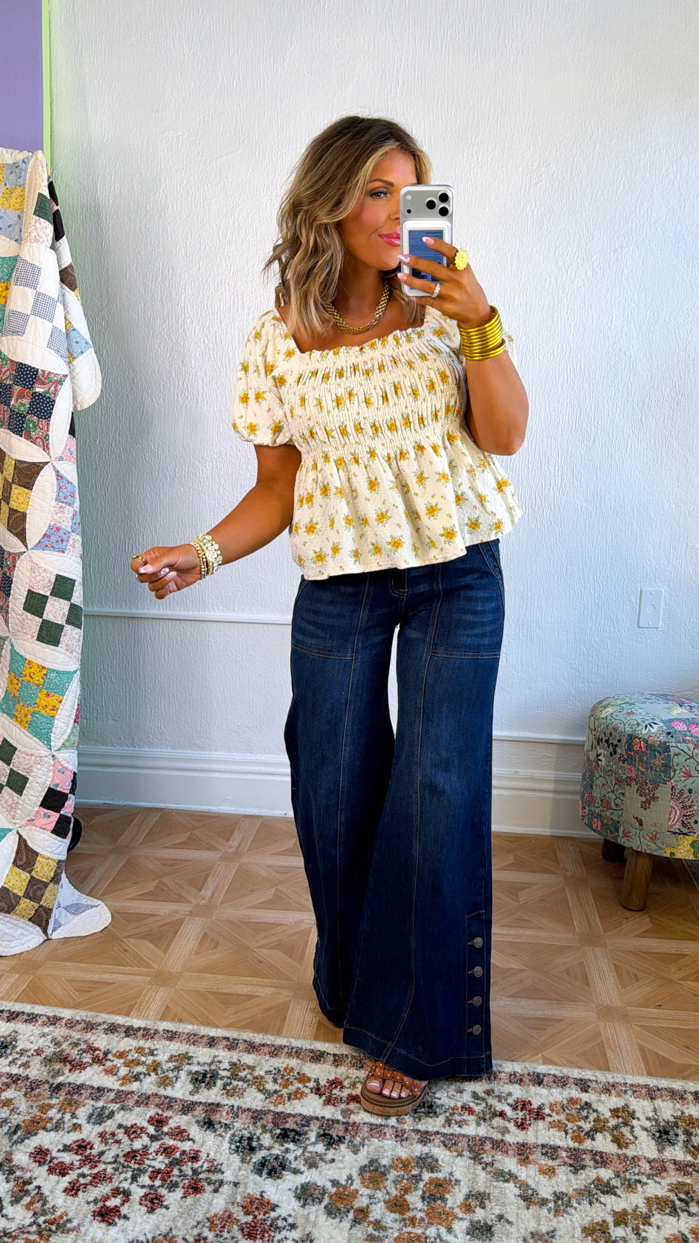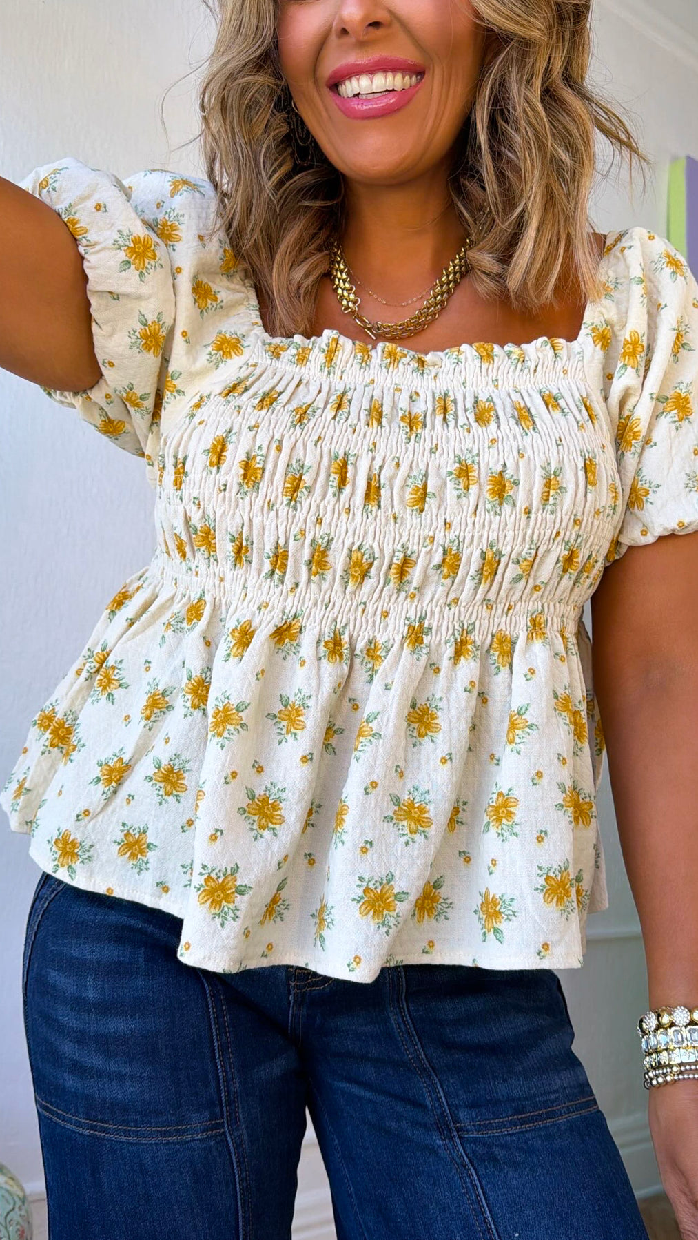 Sweet, feminine, and effortlessly charming the Rosie Ann Smocked Top is a sunshine-filled staple you’ll reach for again and again. Designed with a soft smocked bodice for a flattering, comfortable fit, this top features a delicate cream base sprinkled with cheerful yellow florals for a timeless cottage-inspired look.