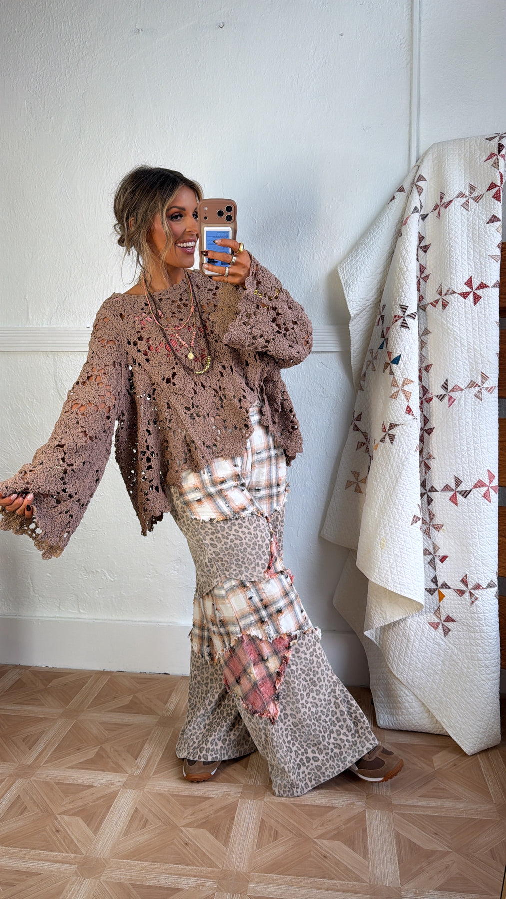 The soft light chocolate hue adds warmth and depth, while the scalloped hem and flared sleeves bring movement and feminine detail. Designed to be worn off one shoulder or relaxed and slouchy, it layers perfectly over tanks, bralettes, or fitted long sleeves for an elevated boho look.