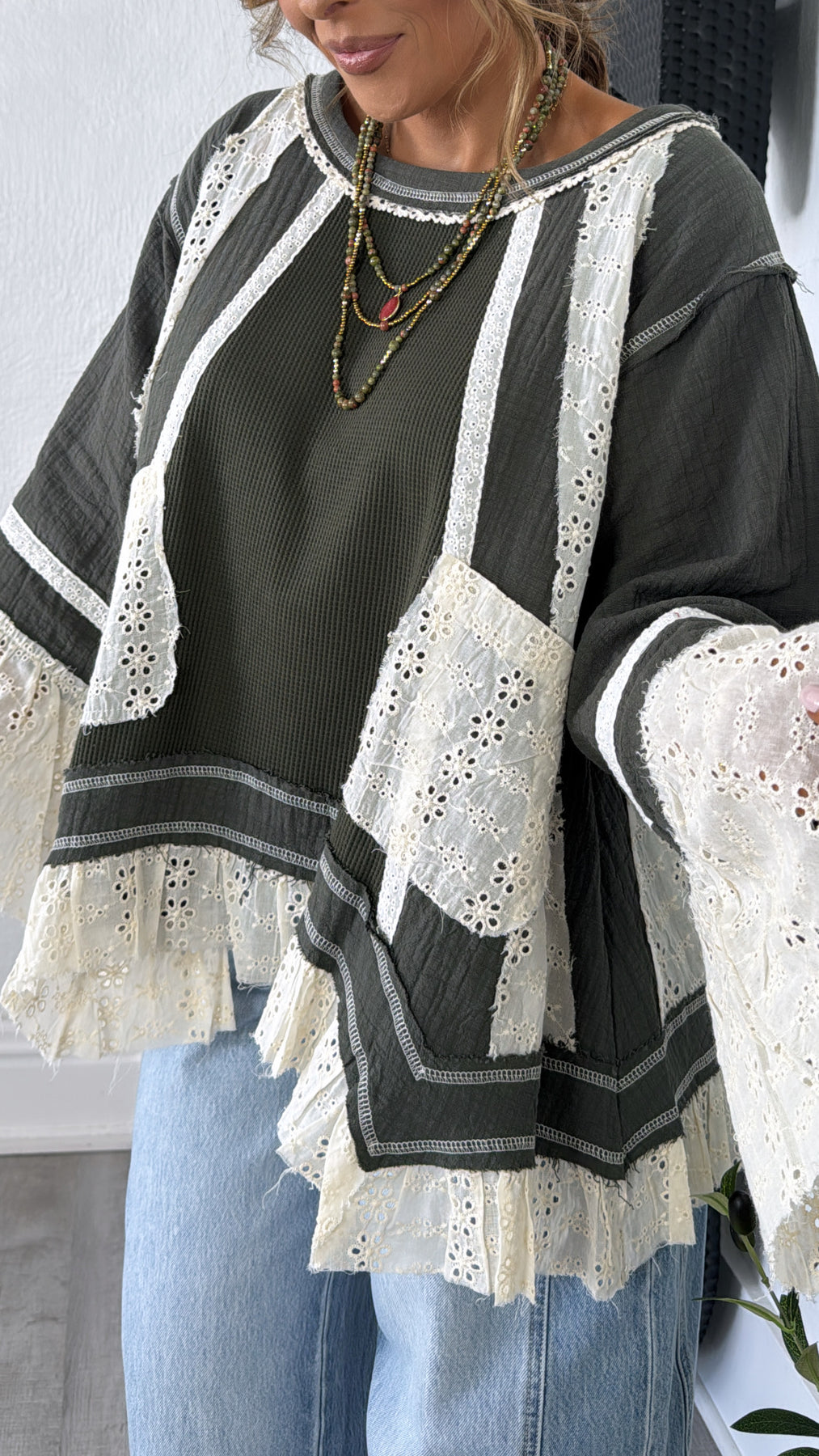 The Sylvie Dainty Detailed blouse mixes vintage-inspired floral eyelet detail, romantic textures, and a classic olive body that is easy to love. Exude elegance in this gorgeous blouse.