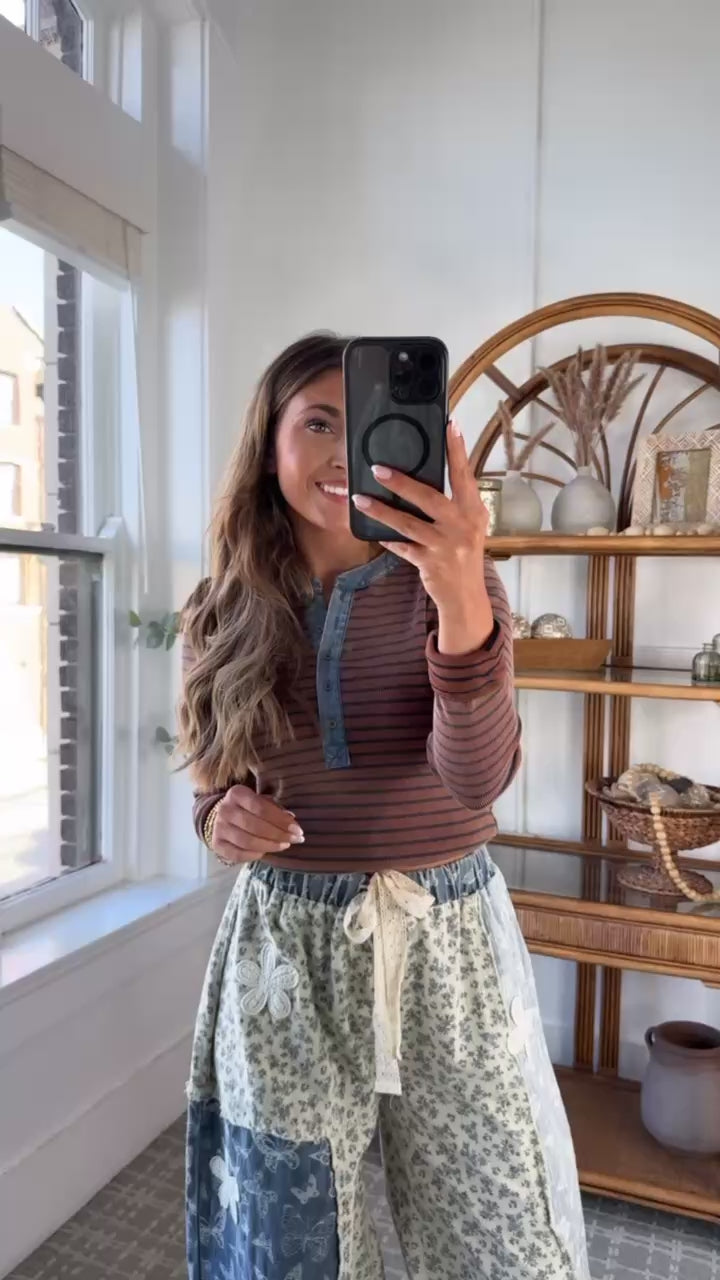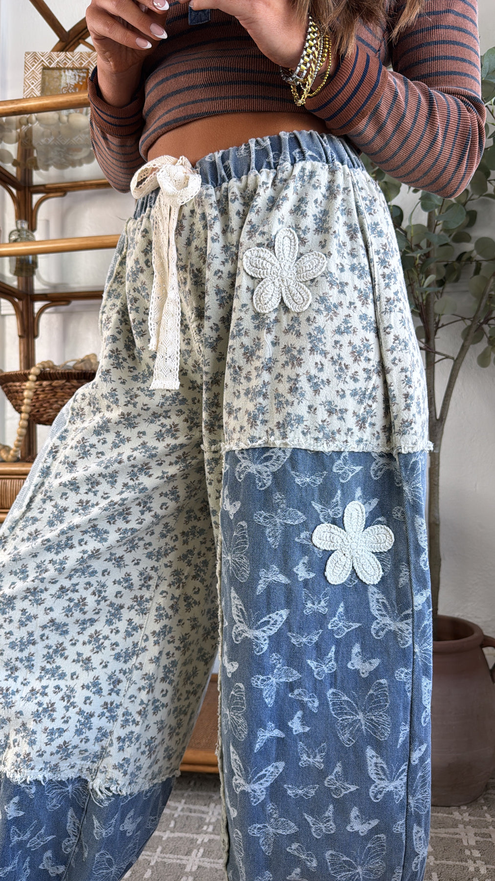 Soft, dreamy, and full of charm the Blue Skies Flutter Joggers are a true boho favorite. Designed with a relaxed, slouchy fit, these joggers feature a beautiful patchwork of blue floral prints, delicate butterfly details, and textured panels that give them a one-of-a-kind, collected feel. The elastic waistband with a lace drawstring keeps things comfy, while the gathered ankle cuffs add an effortless, laid-back finish.