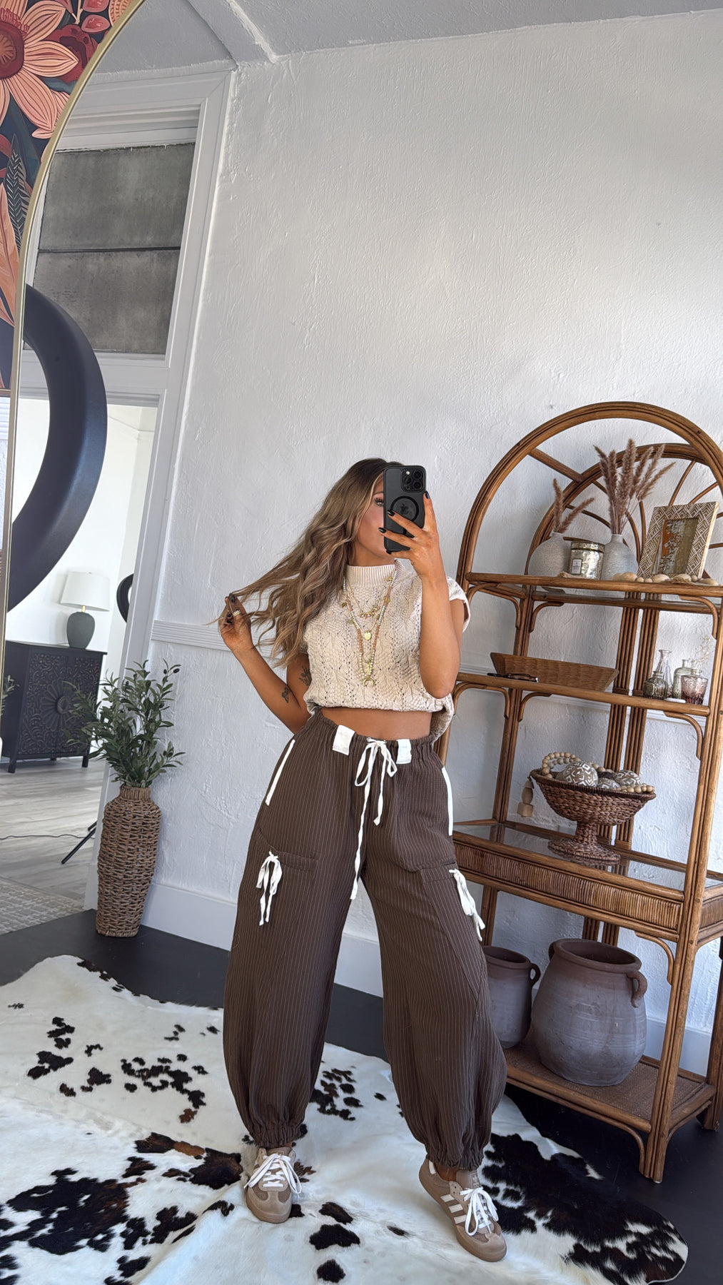 Effortless and cool, these pinstriped jogger-style pants are your new go to for laid back style with a touch of edge. Featuring an elastic waistband with contrast drawstrings and roomy cargo pockets, they’re perfect for pairing with crops, graphic tees, or cozy sweaters. The relaxed fit and cuffed ankles make them a versatile option for errands, casual hangouts, or styling up with a heeled bootie.