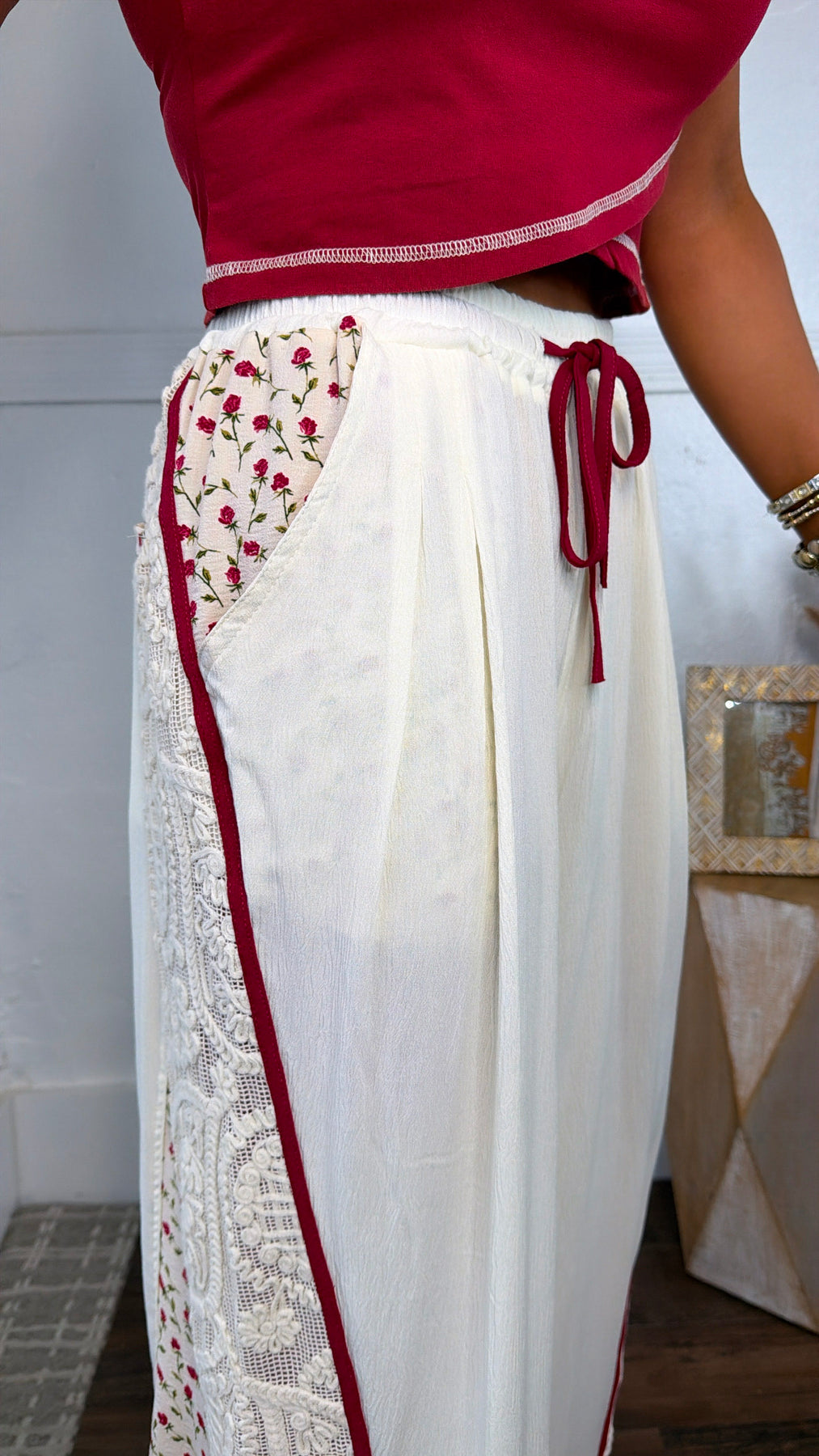 Effortlessly romantic with beautiful vintage inspired details, the Evening Sol Relaxed Pant is the perfect blend of comfort and charm. Designed in a soft cream hue, these flowy wide-leg pants feature delicate lace panels, subtle floral accents, and rich red trim that creates a standout boho look.