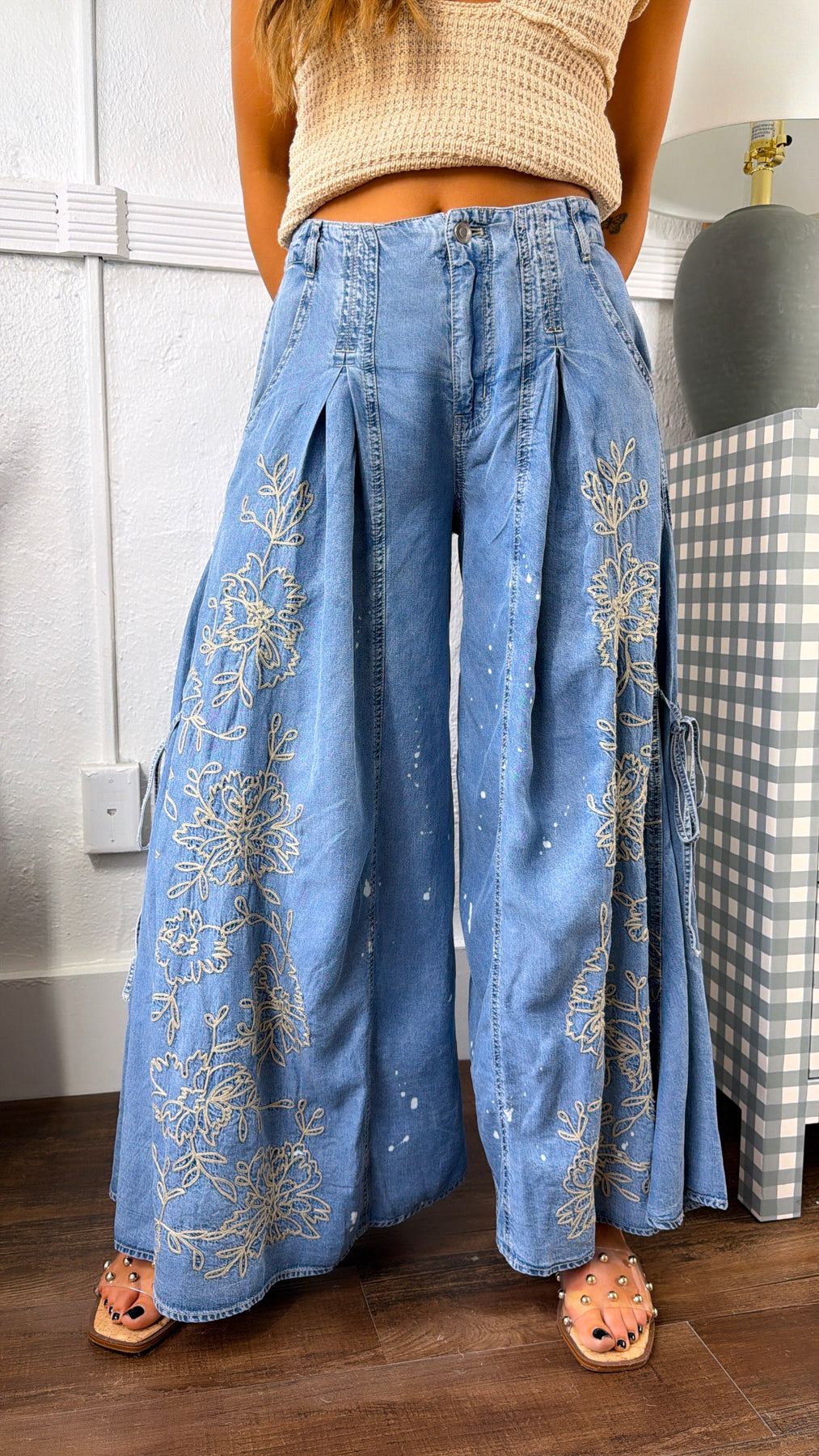 Artistic, flowy, and effortlessly statement-making. The Floral Detail Wide Leg Pants are a standout addition to your wardrobe. Designed with a soft denim wash and oversized wide-leg silhouette, these pants feature beautifully embroidered floral detailing that adds a unique, boho-inspired touch. The relaxed fit and movement make them as comfortable as they are eye-catching.