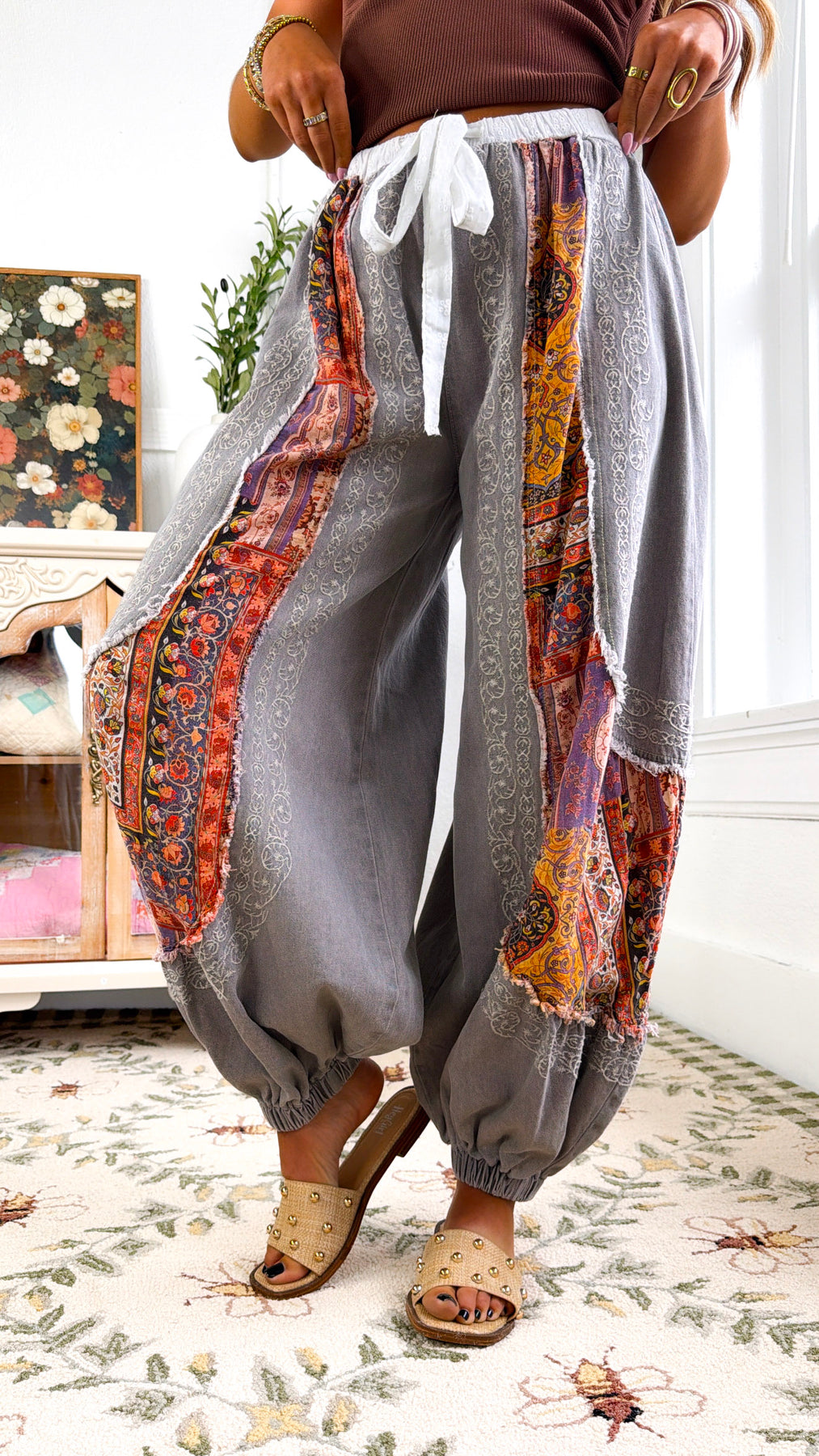 Artful, cozy, and full of vintage-inspired charm. The Solara Embroidered Jogger is a true statement piece. Designed with a relaxed, slouchy fit, these joggers feature a beautiful mix of soft fabrics, delicate embroidery, and patchwork detailing that give them a one of a kind, lived in feel.