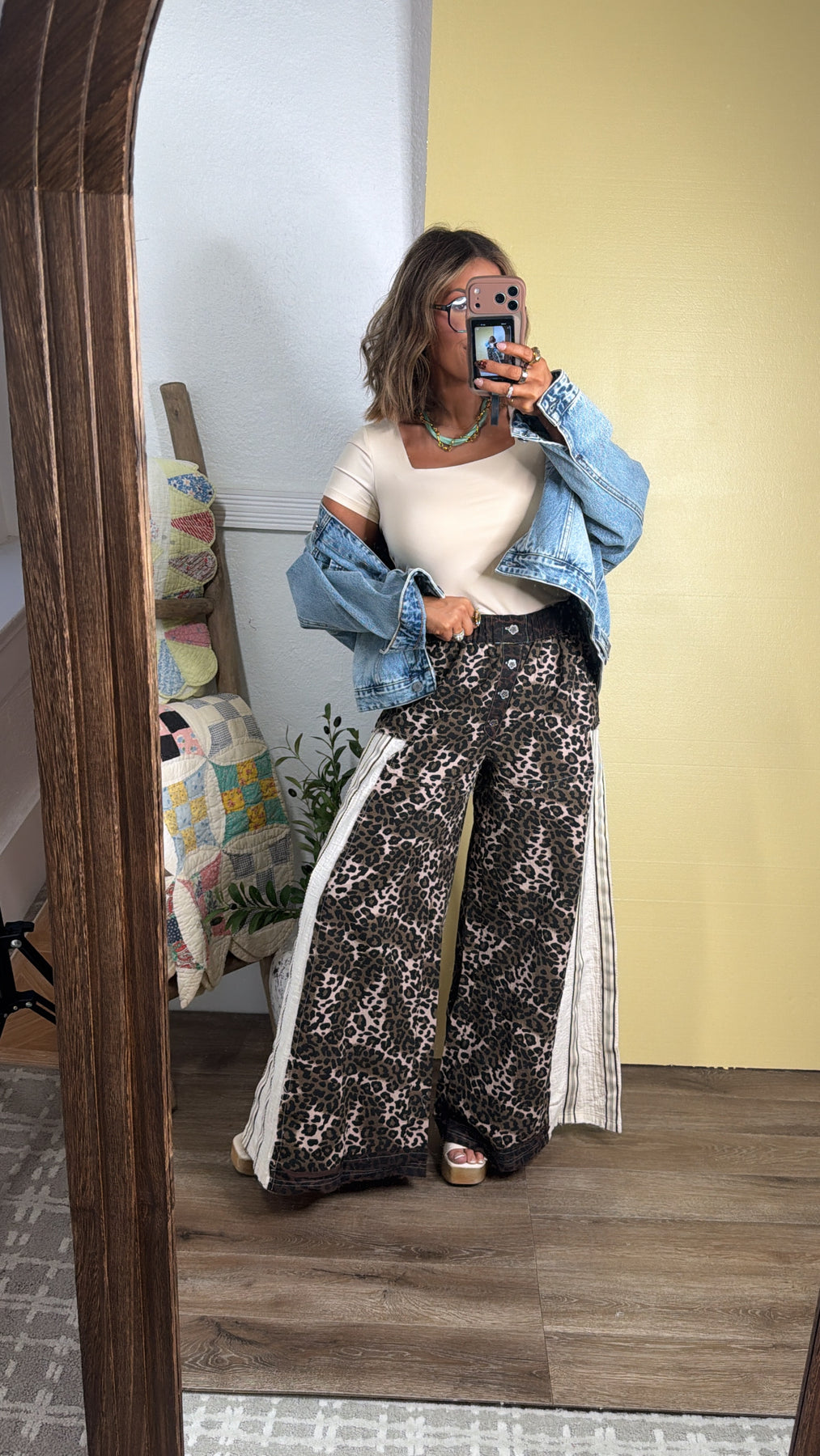 Make a wild statement with the Savanna Patch Wide Leg Pants where bold meets boho in the best way. These flowy, high-waisted pants feature a striking leopard print with contrasting textured side panels that bring dimension and movement. The button-front detail and elastic waistband make them as comfortable as they are stylish.