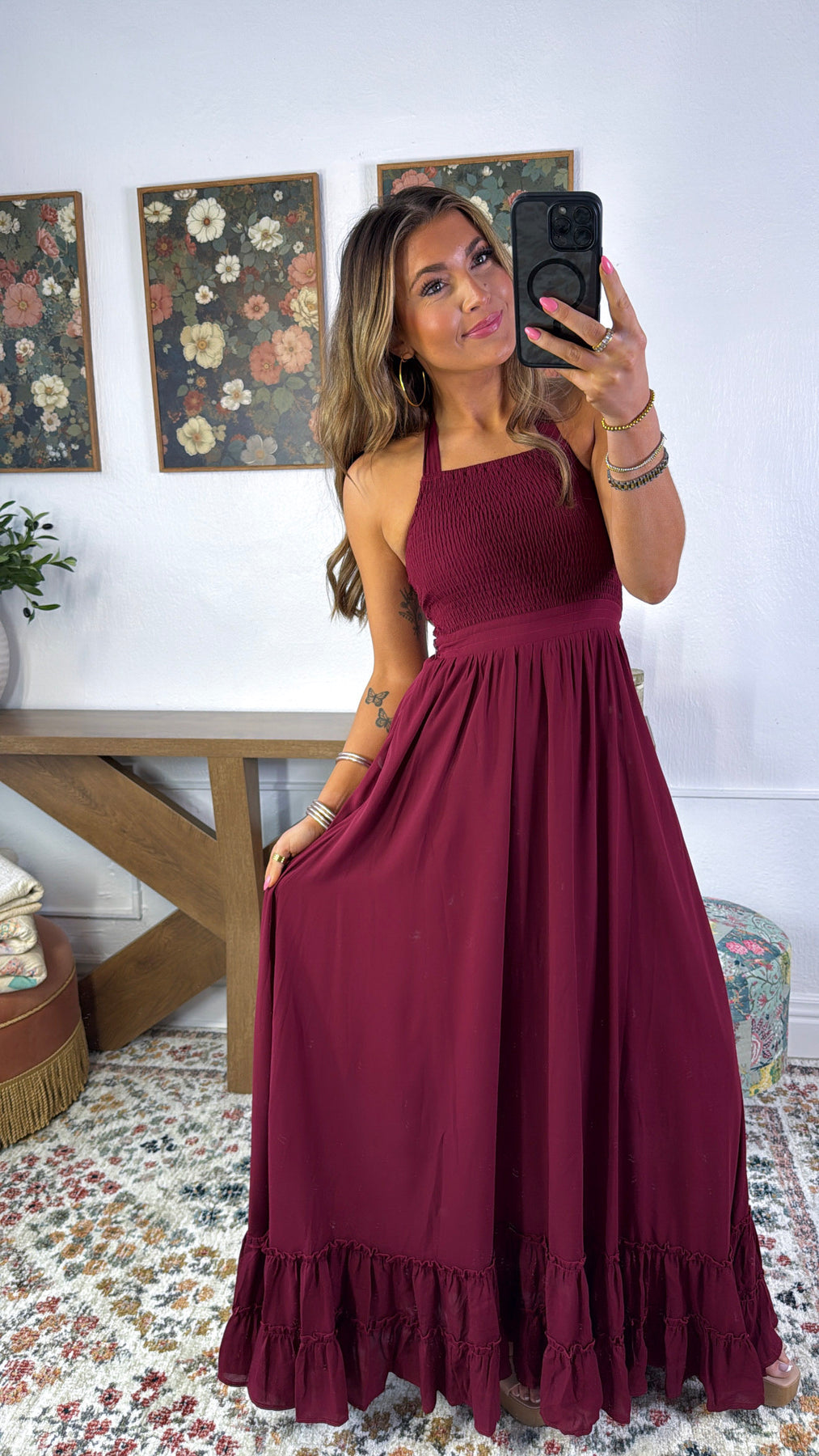 ECB Exclusive: Between the Lines Maxi Dress, Burgundy