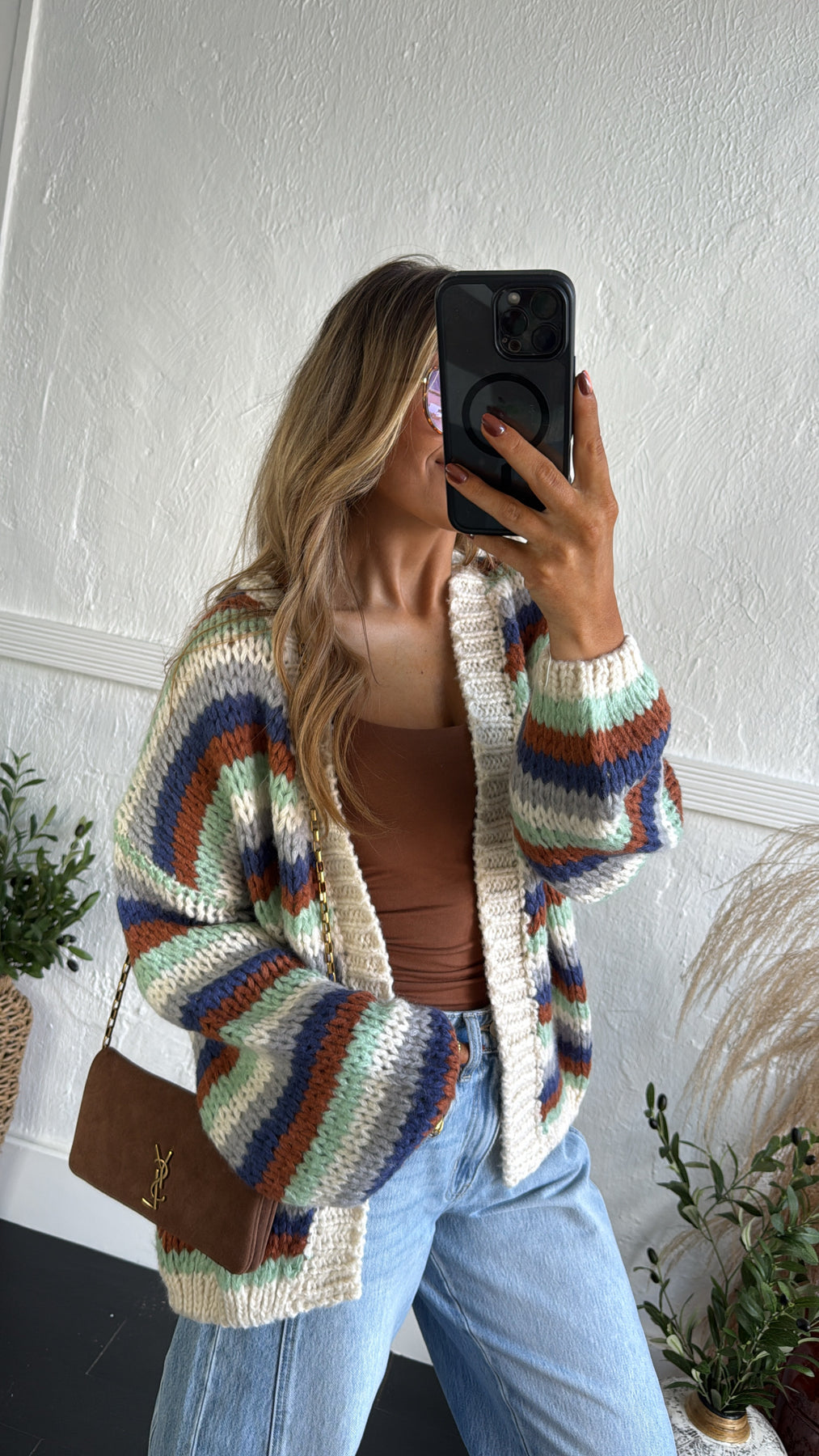 Wrap yourself in cozy charm with our Canyon Skies Knit Cardigan. Featuring soft, chunky yarn in a playful mix of desert-inspired hues of rust, cream, sage, and denim blue. This cardigan brings a touch of warmth and personality to any outfit. The relaxed, open-front fit makes it the perfect layering piece for crisp mornings or cool evenings.
