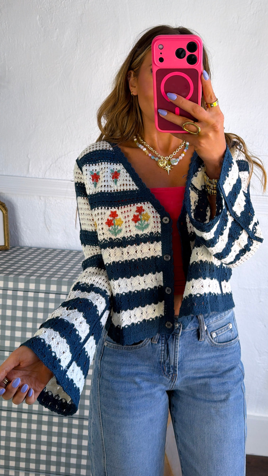 Vintage charm meets playful florals. The Flower Sprout Knit Cardigan in Navy Multi is a statement layering piece full of texture, color, and sweet nostalgic detail. Featuring bold navy and cream crochet striping with embroidered floral accents, this cardigan brings handcrafted character to any outfit.