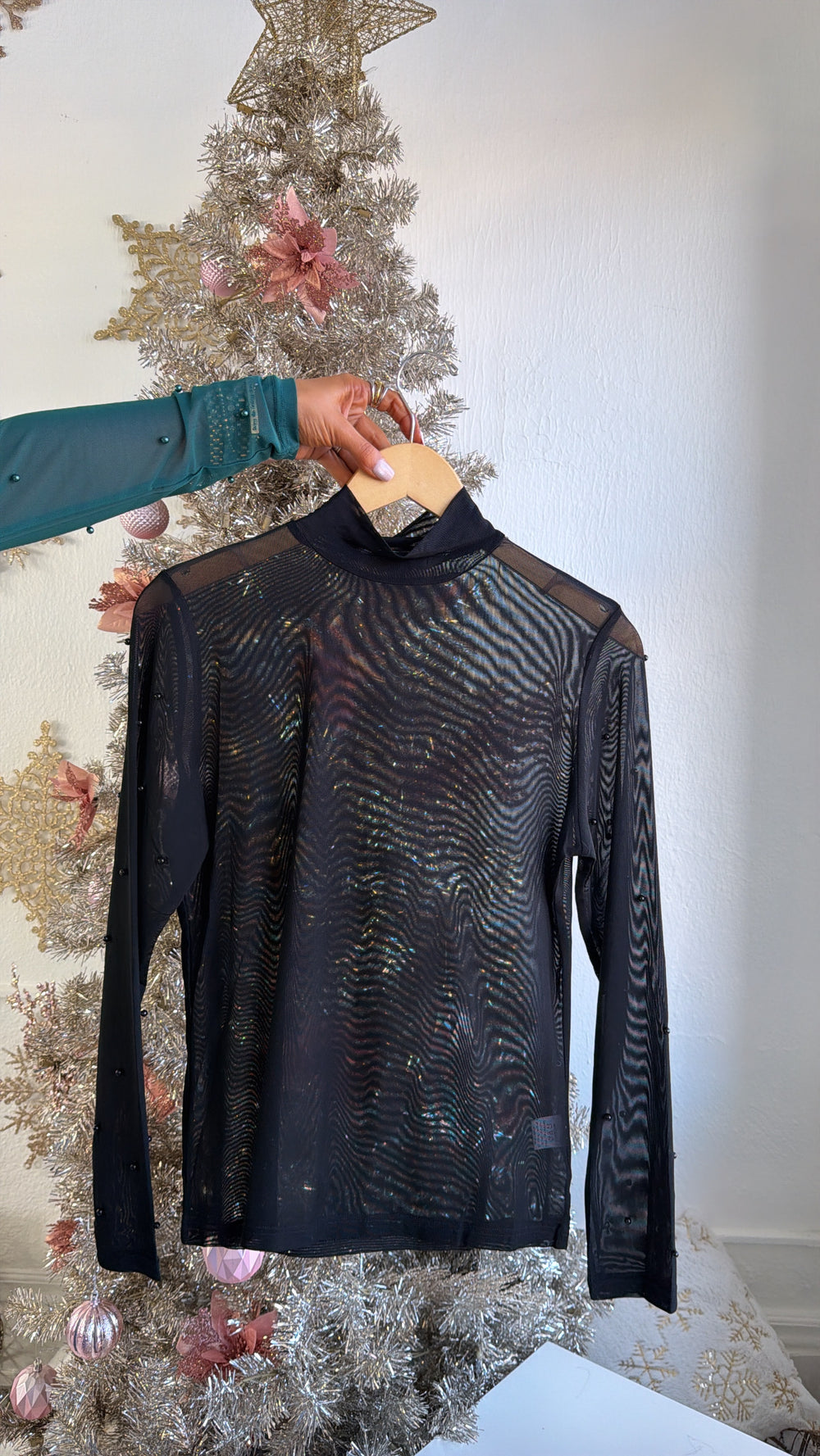 A mesh top with soft pearl accents adding the perfect touch to your holiday outfits. Its Lightweight, breathable, and easy to layer, this top brings a graceful shimmer to any outfit while keeping your look effortlessly chic