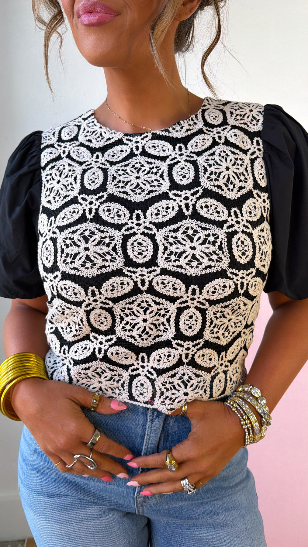 Timeless with a touch of romance. The Antique Lace Puff Sleeve Top blends vintage-inspired lace with a flattering modern silhouette for an effortlessly polished look. Featuring intricate crochet-style lace across the bodice, this top brings beautiful texture and detail while still feeling lightweight and comfortable.