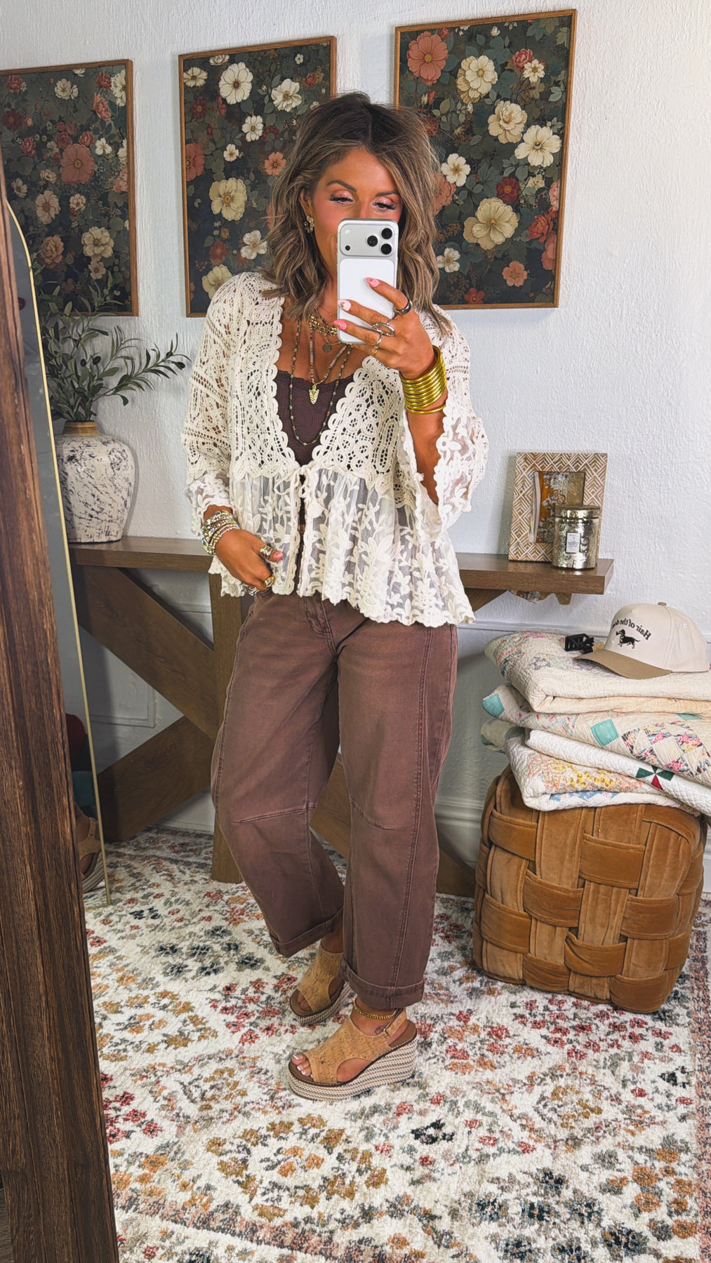 Soft, romantic, and effortlessly boho. The Clover Wind Crochet Cardigan Top features delicate lace crochet detailing with a lightweight, flowy silhouette that layers like a dream. Designed with a flattering peplum-style hem and a sweet tie-front closure, this piece adds instant charm to any outfit.