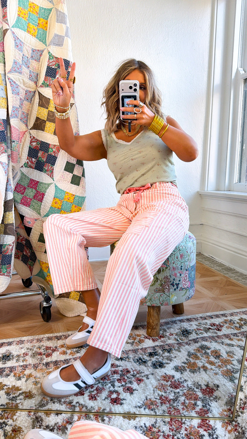 Fun, fresh, and effortlessly cool the Dune Twill Barrel Pant is the statement bottom your wardrobe needs. Designed in a soft coral peach and ivory stripe, these pants feature a relaxed barrel-leg silhouette, utility-inspired patch pockets, and an adjustable rope drawstring waist for the perfect laid-back fit.