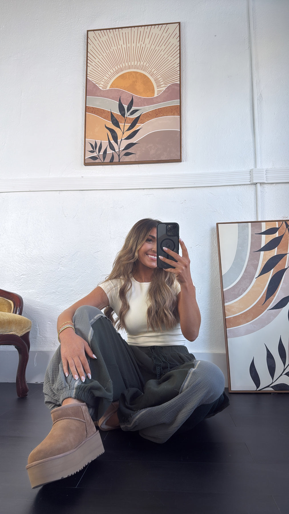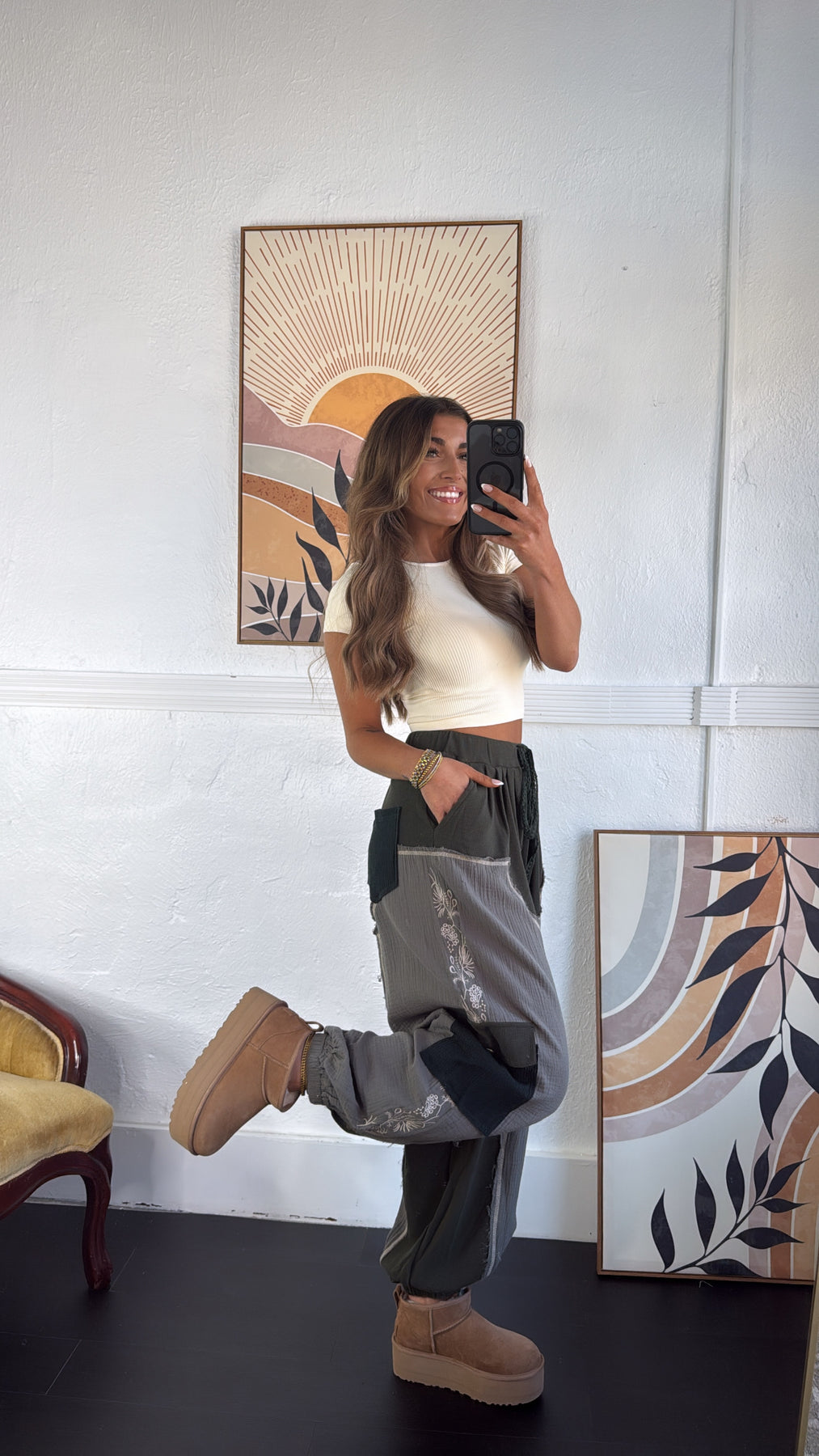 Meet your new favorite statement pant, a mix of comfort, creativity, and cool-girl energy. Designed with a patchwork blend of textured fabrics, these cargos feature tonal olive and sage hues, raw edge seaming, and embroidered floral detailing that give them that effortlessly lived-in, one-of-a-kind feel.