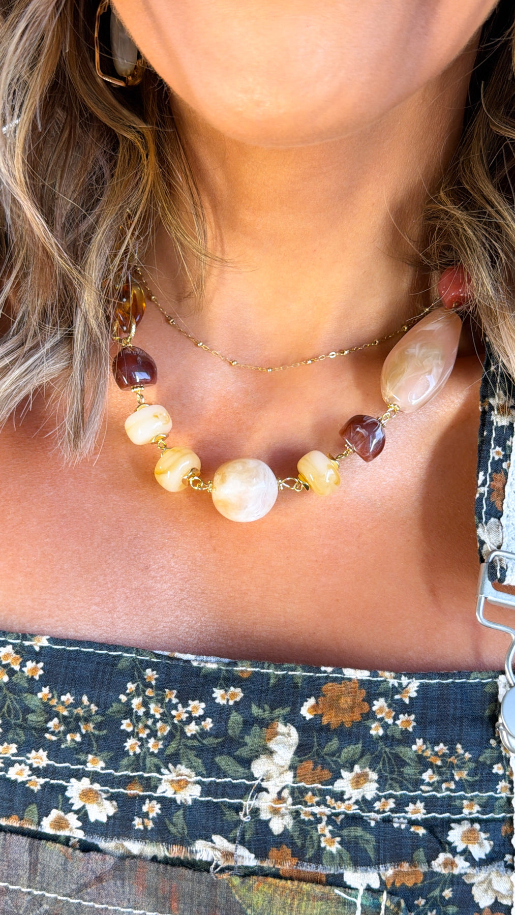 Earthy elegance with a boho soul. The Multi Gemstone Necklace features a stunning mix of neutral-toned gemstones in warm brown, cream, and honey hues, delicately linked with gold accents. Each stone brings natural texture and depth, creating a look that feels organic, elevated, and effortlessly wearable.