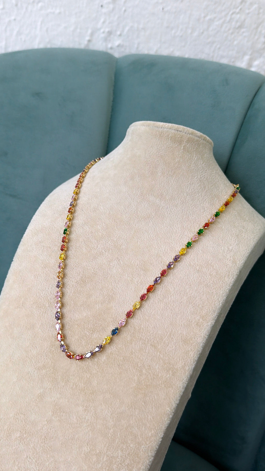 This necklace is pretty, but I took a star off for the way it lays. When you wear it, it lays in a way that you can’t see the colored ‘gems’ at times and you can only see the gold brackets they’re set in. From a downward angle (looking up at the necklace as shown in the photos) the gems are completely visible! But if you’re eye level or taller looking at the neckline, the gold brackets are more visible than the gems.