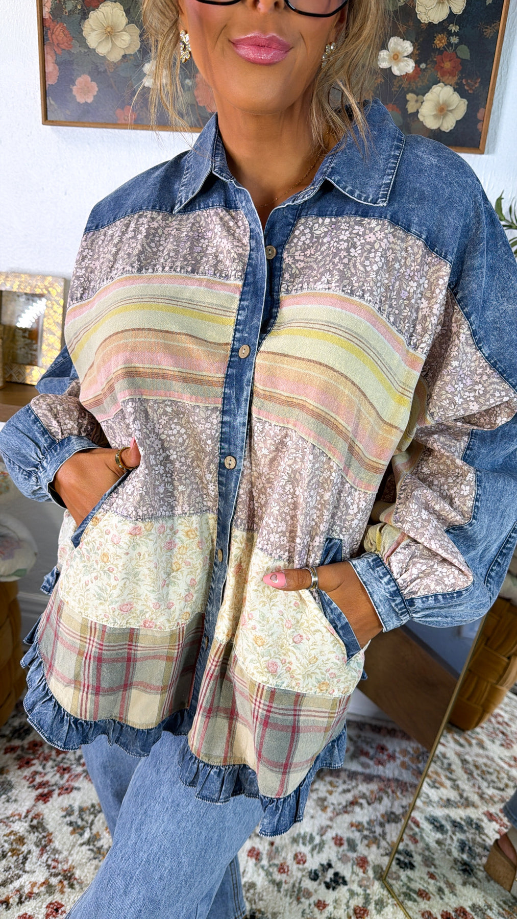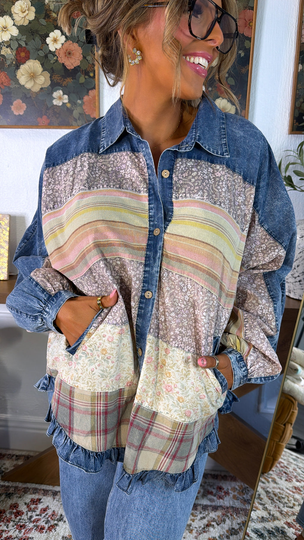 Patchwork perfection with an effortlessly cool vibe. This oversized button up blends classic denim with soft floral and stripe patchwork for a look that feels vintage inspired and totally one-of-a-kind. Designed with a relaxed, slouchy fit and mixed textures throughout, it’s the ultimate throw on piece for laid-back days with standout style.