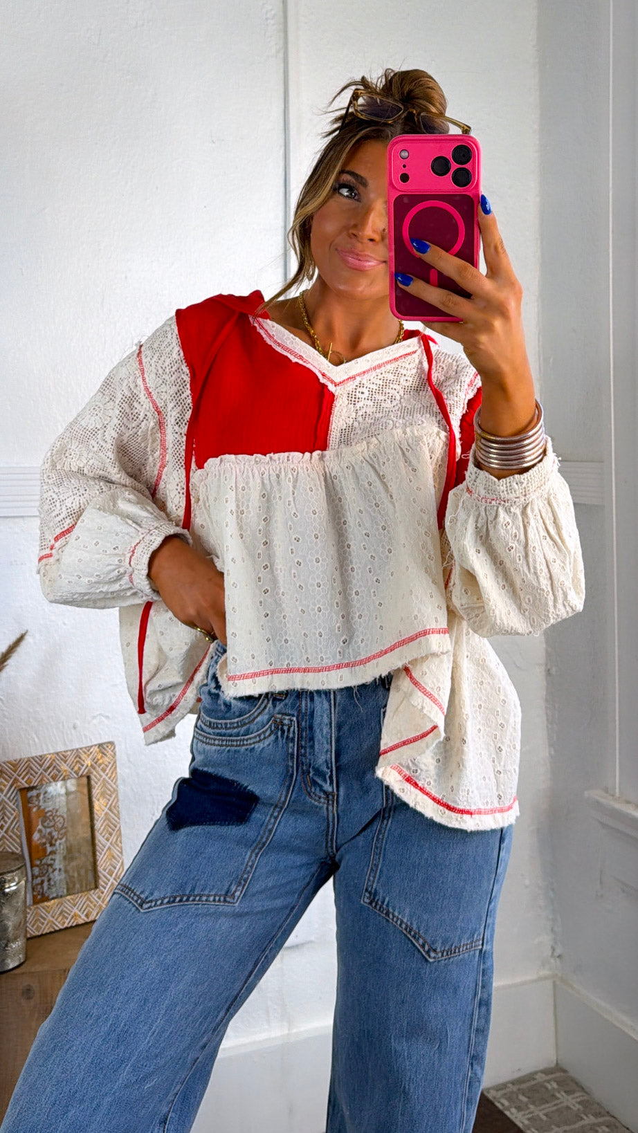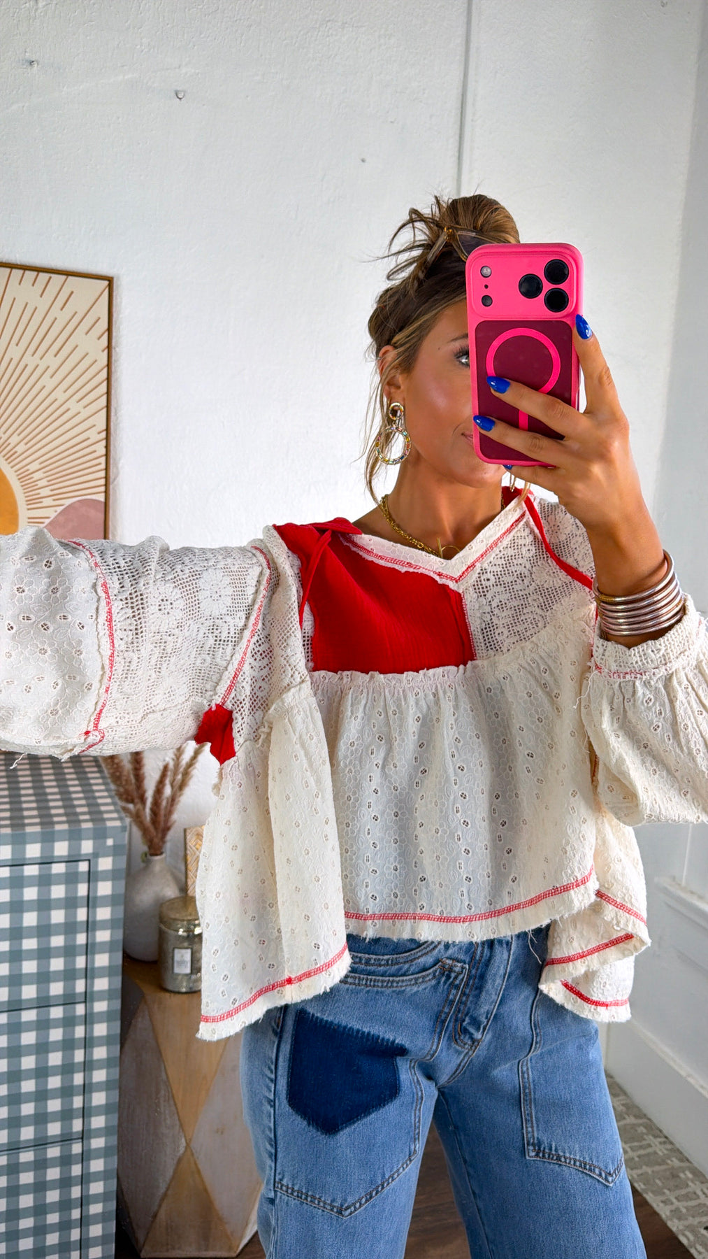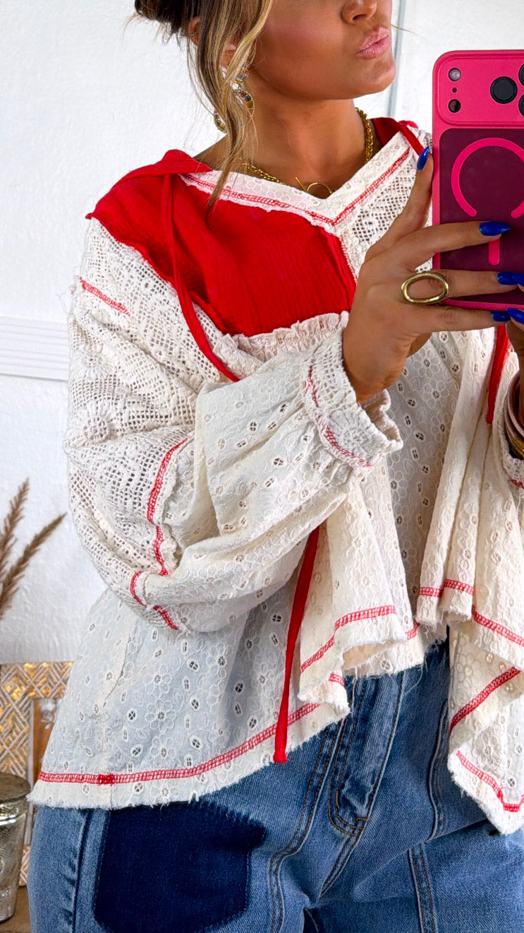 Playful, airy, and full of charm. The Soft Skies High Low Top brings a beautiful mix of texture and color to your wardrobe. Designed with delicate eyelet fabric and bold apple red contrast panels, this top creates a dreamy boho silhouette with its relaxed fit and flowy high-low shape.