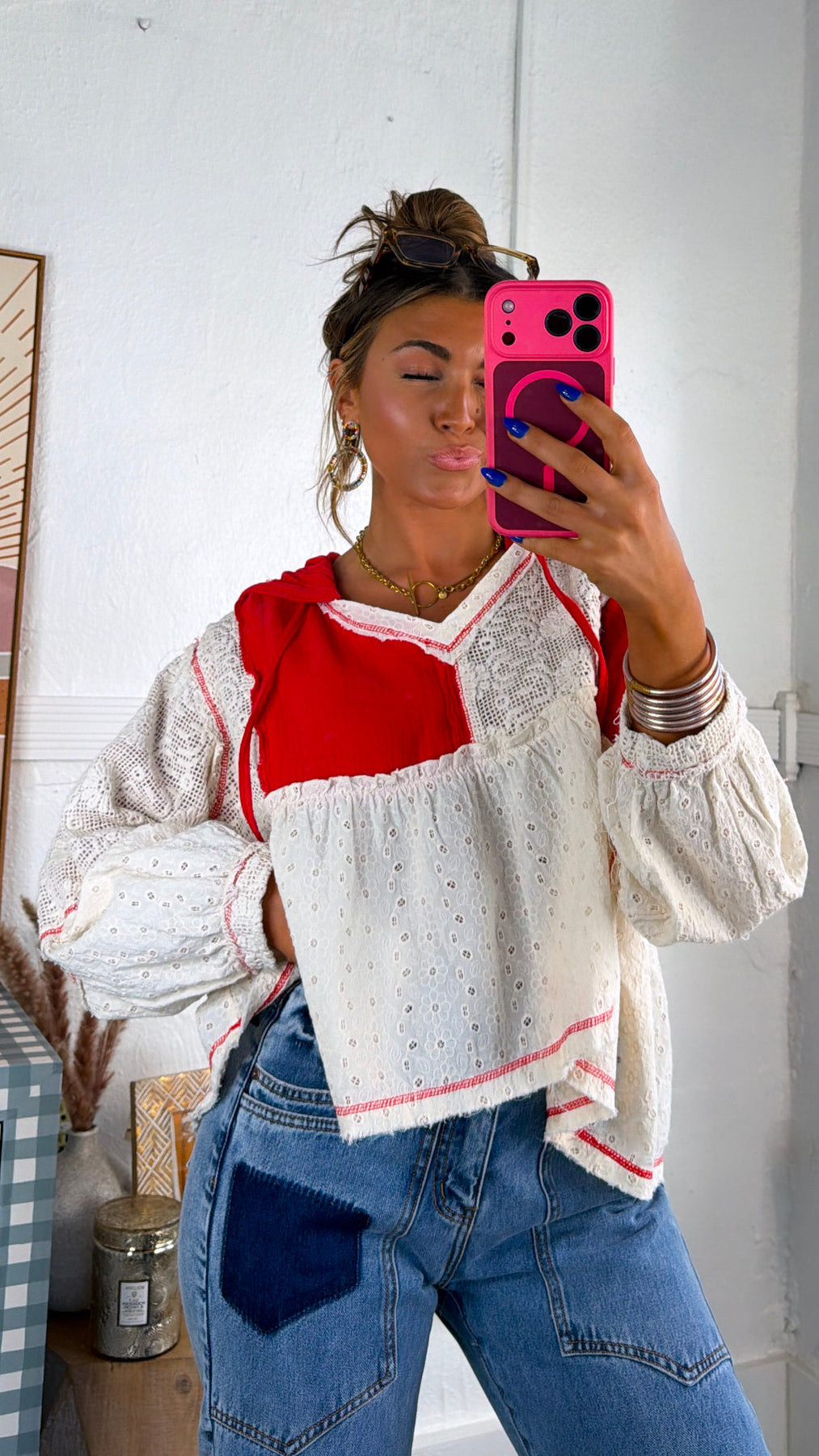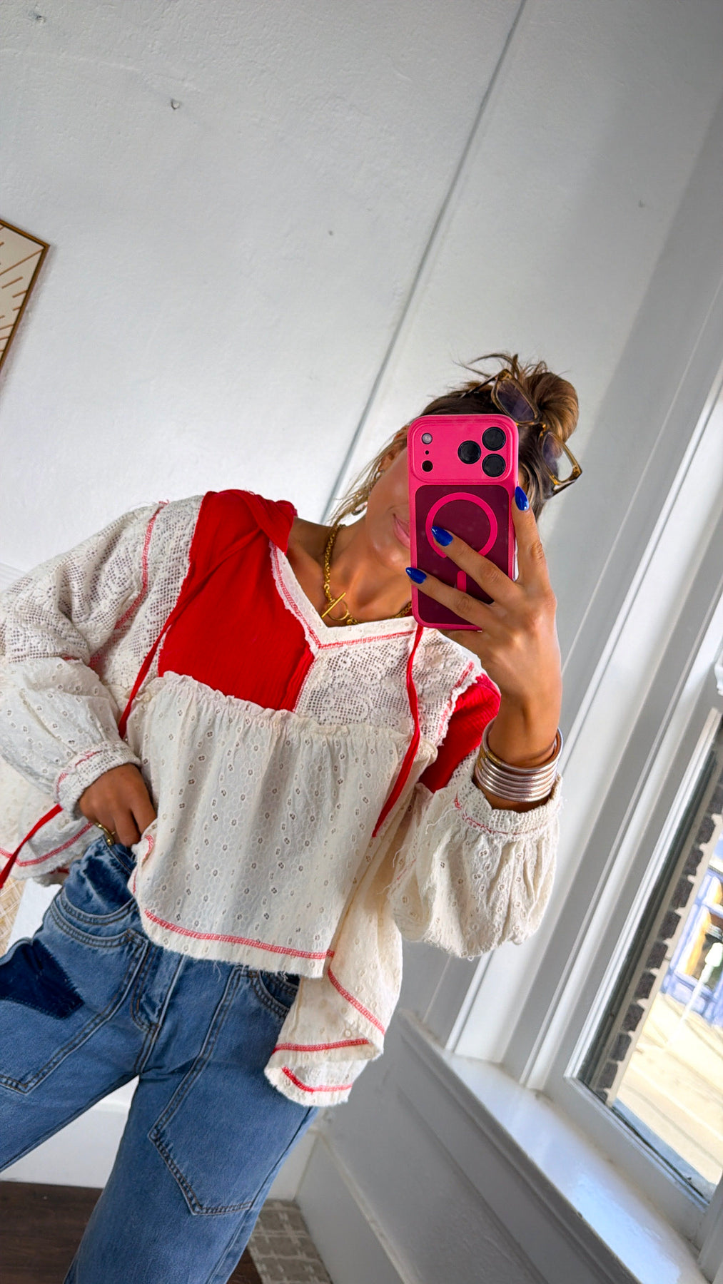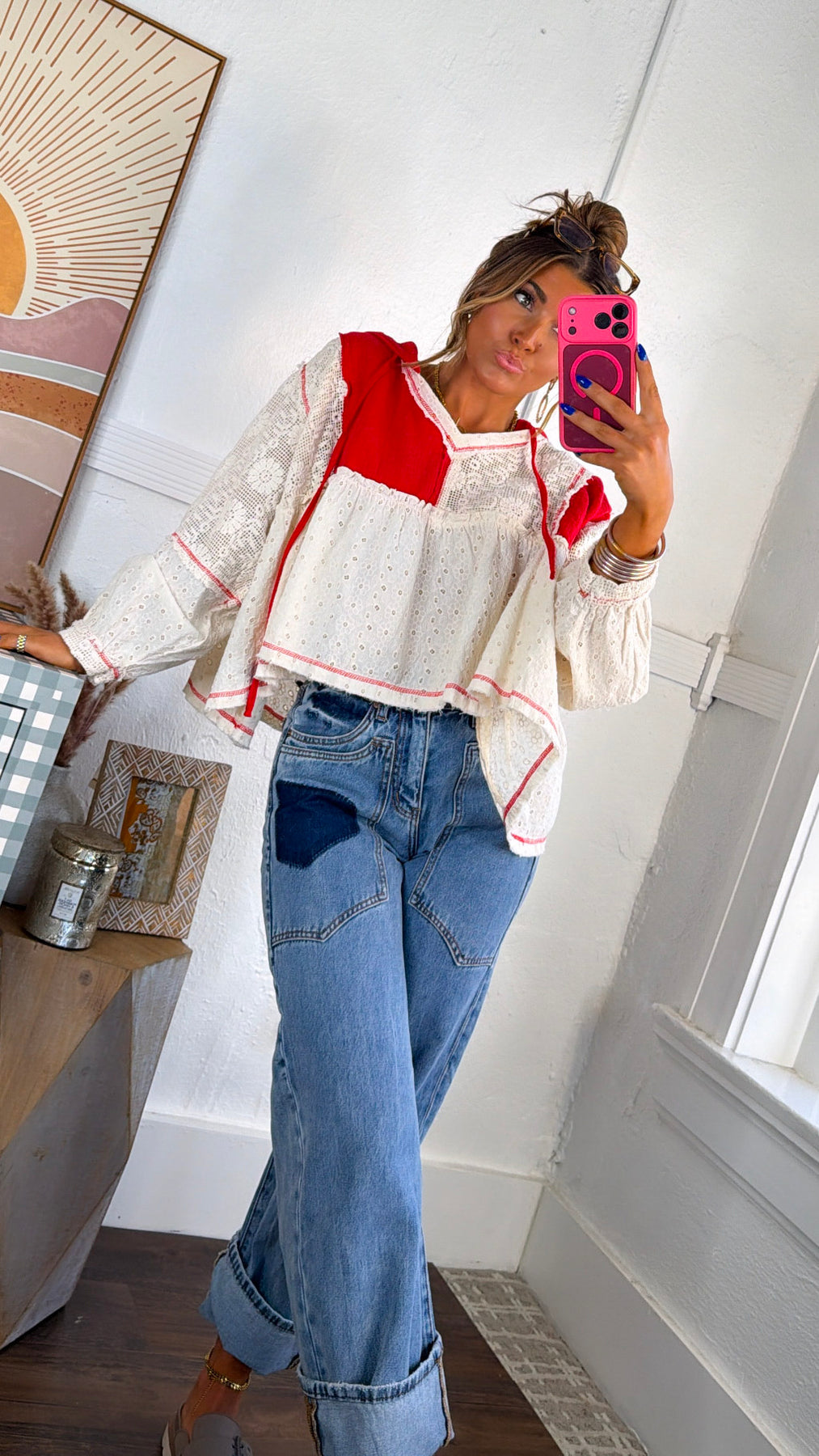 Playful, airy, and full of charm. The Soft Skies High Low Top brings a beautiful mix of texture and color to your wardrobe. Designed with delicate eyelet fabric and bold apple red contrast panels, this top creates a dreamy boho silhouette with its relaxed fit and flowy high-low shape.