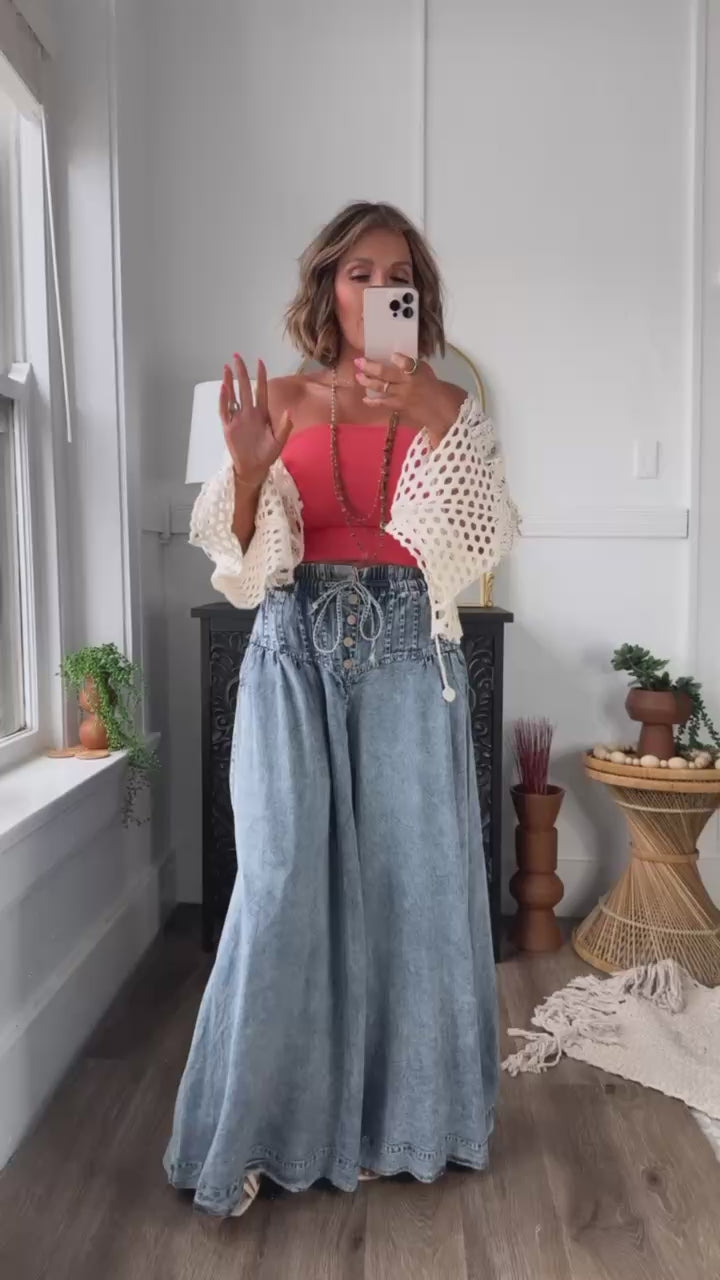 Take on an urban boho chic look with these Denim Pants. The trendy wide leg bring boho style to your wardrobe. These Playfully pants will become your favorite go-to pants!