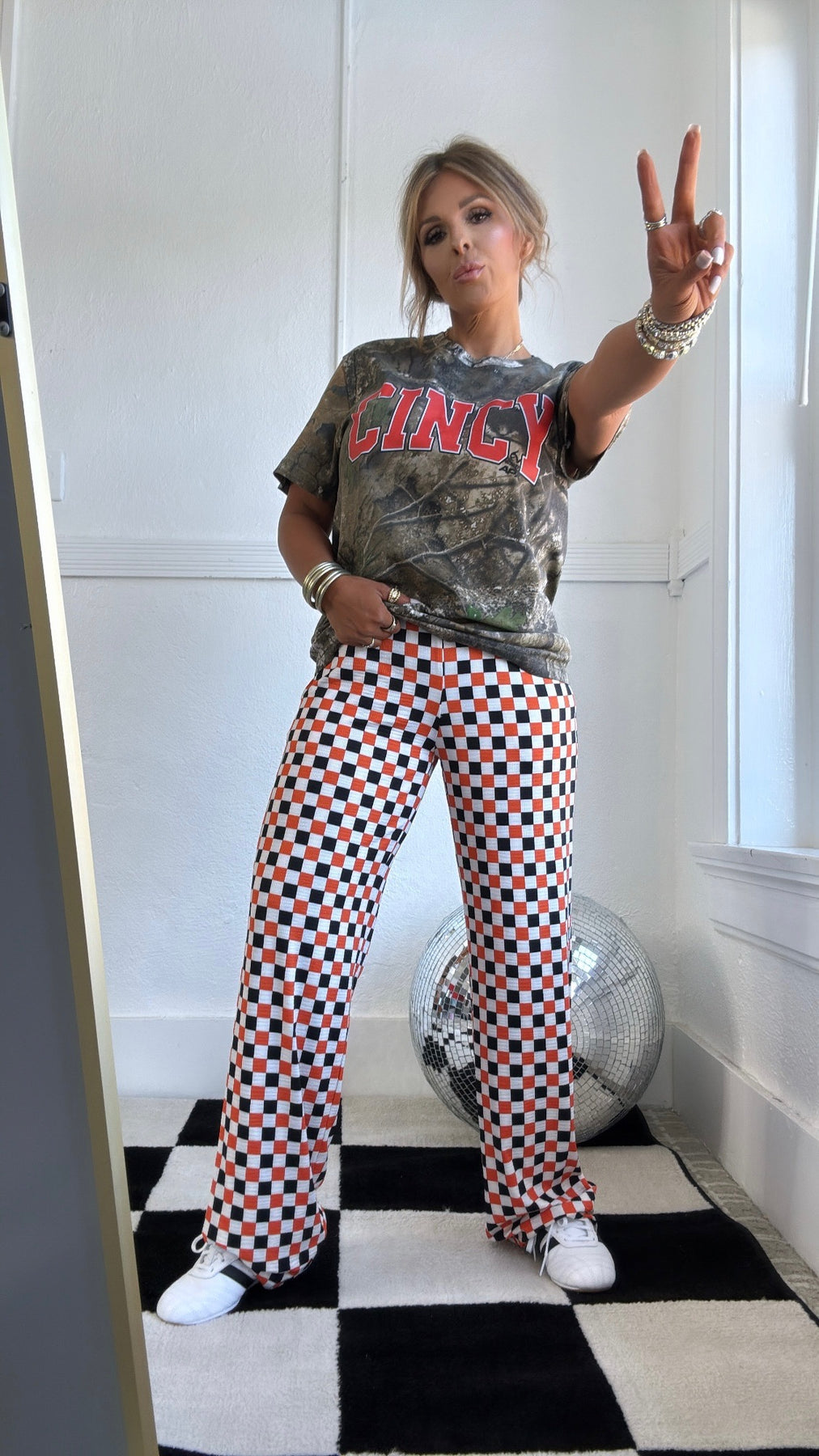 Stay on trend in our Camo Cincy Graphic Tee. A stylish and fun choice that effortlessly adds a touch of flair to your game day outfit. A perfect tailgate or stadium look everyone will love.