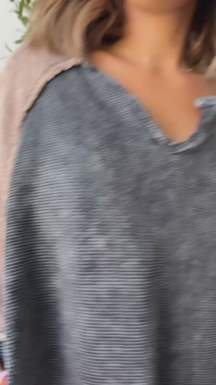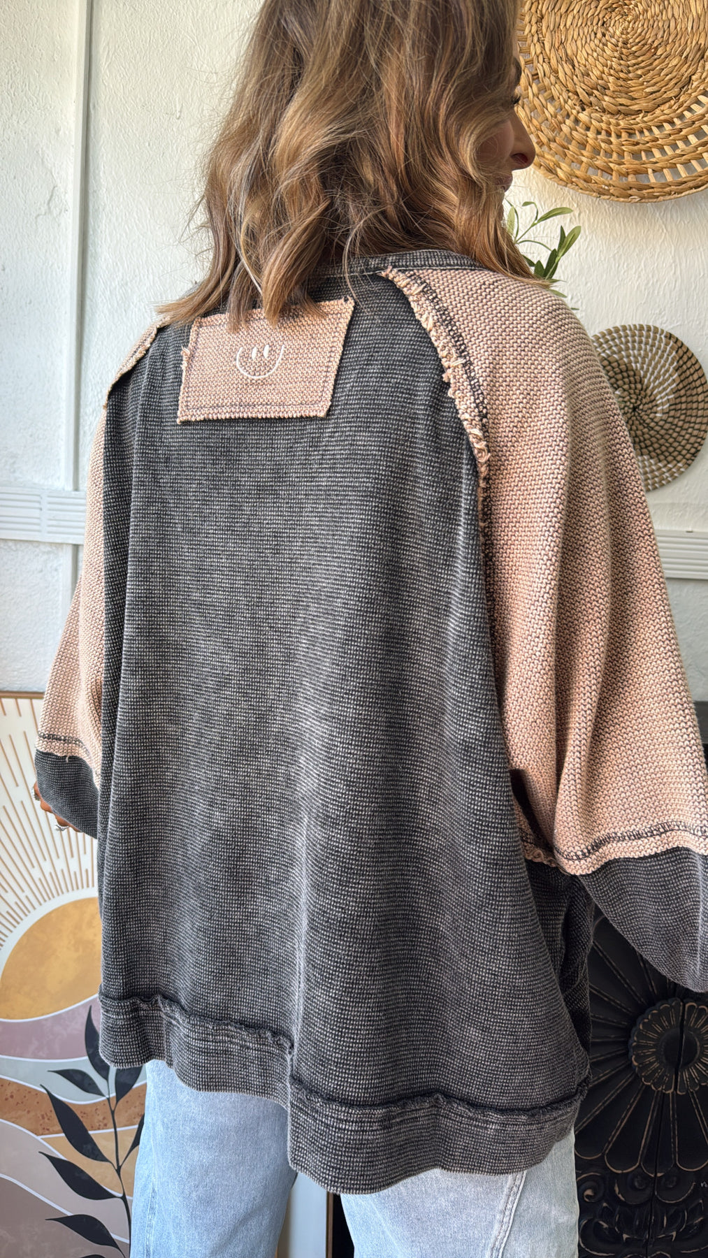 Embrace fall, moody vibes in the OLI & HALI: Mood Stitched Oversized Top! This top features a premium stitched fabrication, exposed seam detail, and a color-block design.