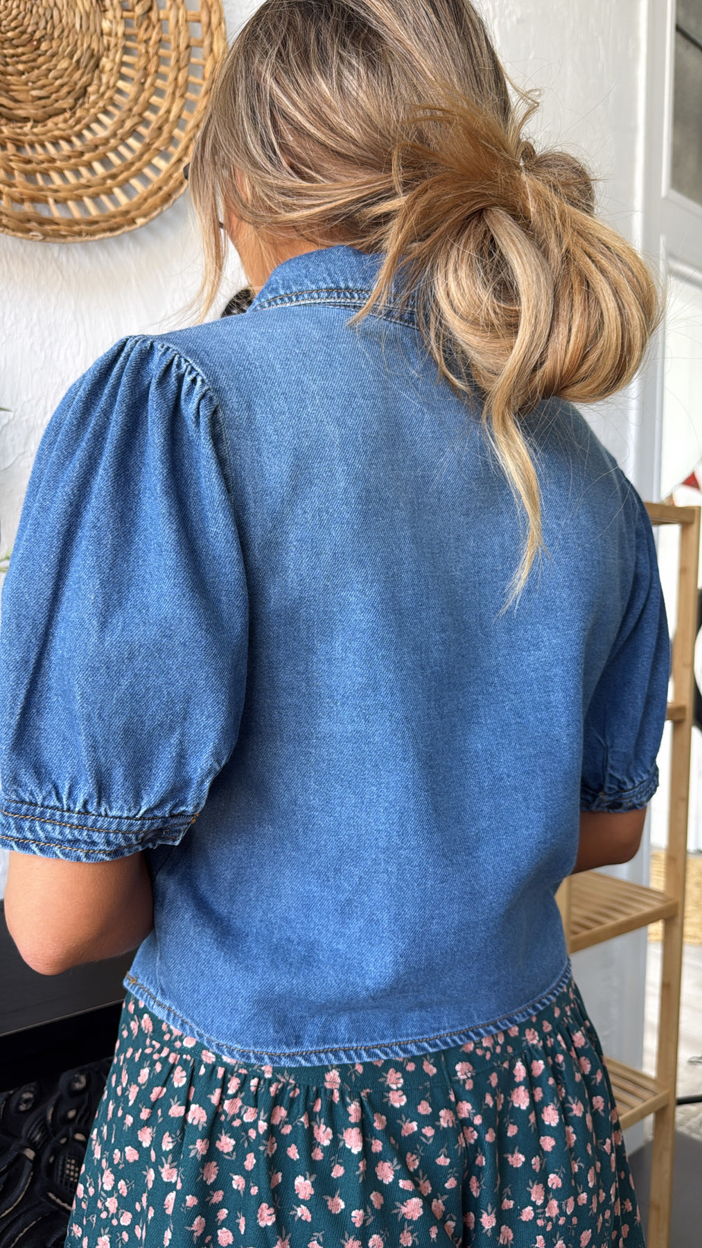 Chic, cropped, and effortlessly cool — the Riverstone Button Up by RISEN is your new denim go-to. Featuring a deep V neckline and puff sleeves, this cropped shirt brings a feminine twist to classic denim!