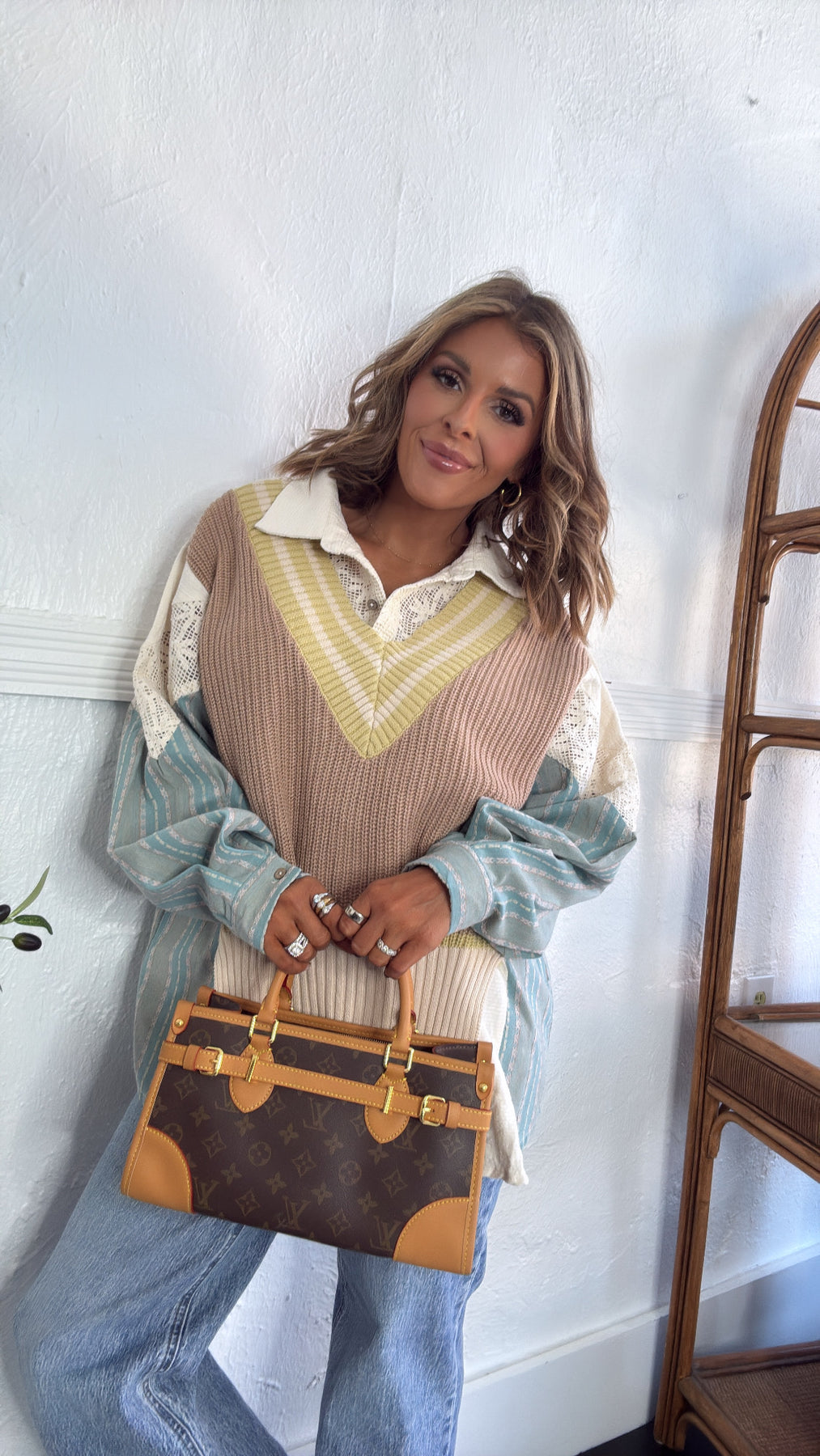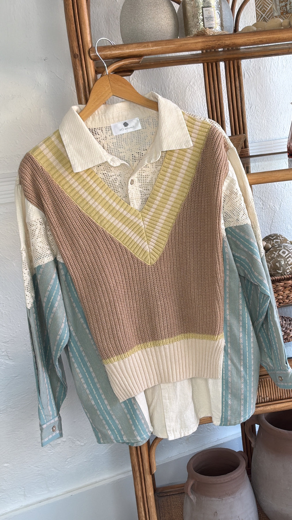 This faux layered-look pullover vest and button down shirt combo is a modern take on laid-back boho chic. The oversized striped button-down with lace accents is perfectly complemented by a chunky knit vest in warm neutral and soft lime tones. It’s a playful mix of textures and patterns that makes styling effortless—just add denim and your favorite accessories for a polished yet relaxed vibe.