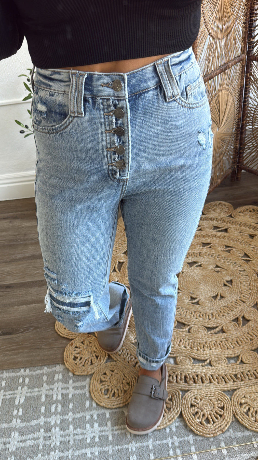 Our Ford Button Fly jeans are designed to give you confidence and comfort all in one. Featuring a flattering high rise with an exposed button fly, they’re crafted with a hidden tummy control panel that smooths and supports for the perfect fit. The light wash denim and bold knee distressing bring that lived-in, vintage-inspired vibe, while the straight-leg silhouette keeps them endlessly versatile.