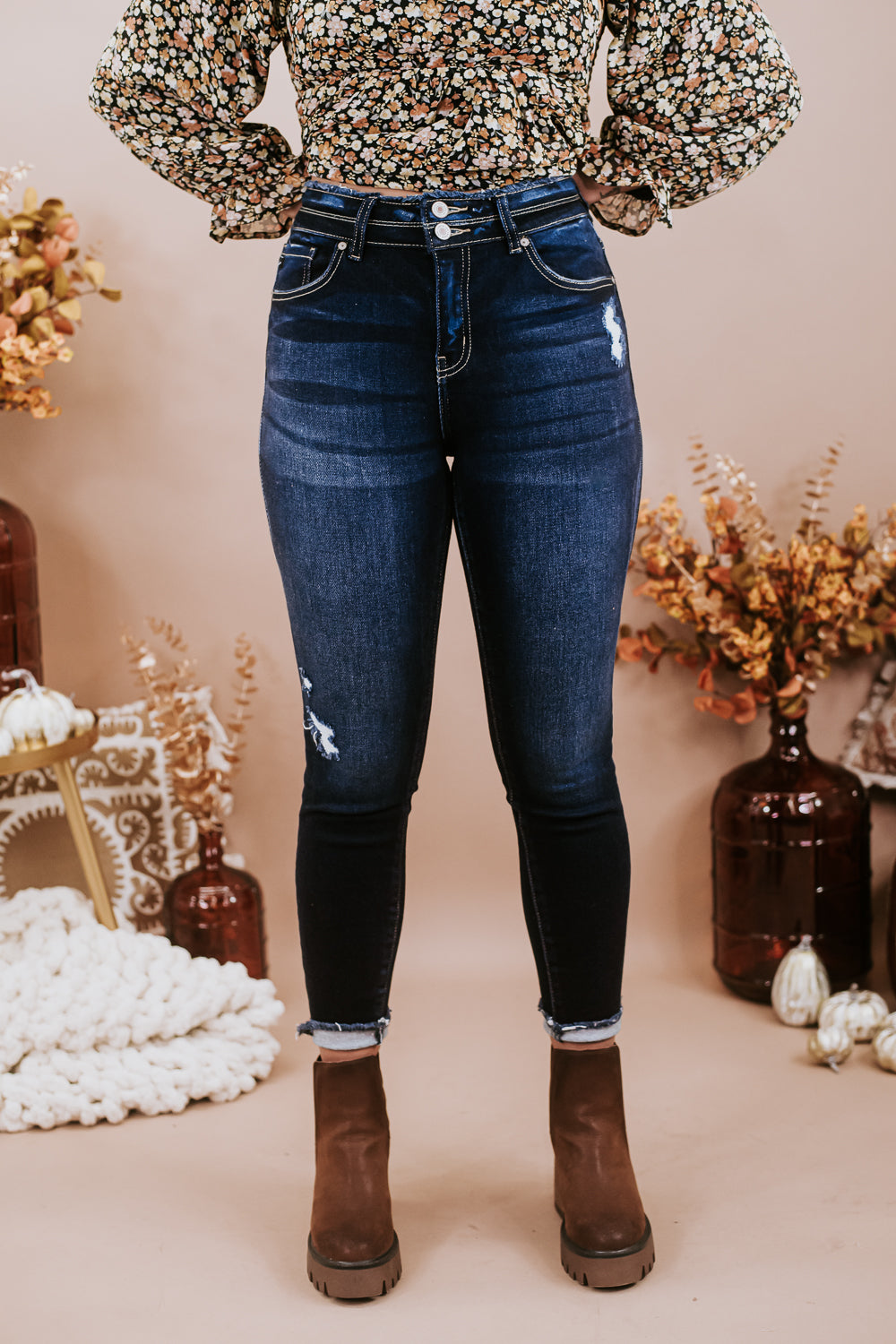 High Rise Distressed Detail Wide Leg Jeans, Dark RISEN